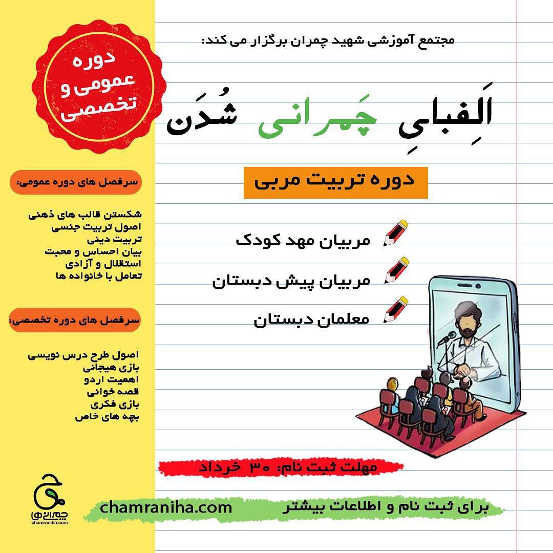 خبر خبر خبر مهم ویژه معلم ها‼️‼️ . . . . . اگر معلم هستید یا به معلم شدن علاقه دارید، 📚دوره ی مجازی الفبای چمرانی شدن 📚 مخصوص شماست* 😎 «تربیت مربی به سبک چمرانی» یک دوره ی تکرارنشدنی تربیتی و آموزشی با اساتید باتجربه مجموعه شهید چمران😊 ✅دوره ی عمومی ✅دوره ی تخصصی ⭕کارگاه های آنلاین و آفلاین ⭕ 🟪 مهلت ثبت نام: فقط تا ۳٠ خرداد🟪 ❗امکان پرداخت قسطی در دومرحله وجود داره! 🎁 ثبت نام گروهی بالای ۳نفر، شامل ۲۰ درصد تخفیف میشه‼️ برای کسب اطلاعات بیشتر و ثبت نام به لینک در استوری یا سایت چمرانی ها سربزنید⬇️ chamraniha.com ➕بفرستید برای معلم ها که جانمونند🤗 . #چمران_فقط_یک_مدرسه_نیست #تربیت_مربی_کودک #تربیت_کودک#معلم #معلم_چمرانی #تربیت_مربی #تربیت_دینی #تربیت_جنسی#طرح_درس #دوره_تربیت_مربی#دوره_آموزشی