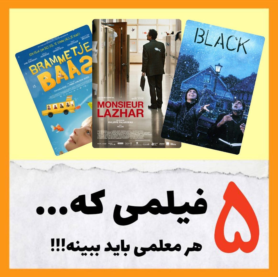 پنج فیلم که نباید معلم ها از دست بدن‼️ . اهل فیلم دیدن هستی⁉️🎞 . . . . این روزها وقت مناسبیه برای تماشای فیلم های خوب از همه جای دنیا!📀 . شما معلم یا مربی هستی؟ پس این پیشنهاد ویژه تر از همه برای شماست😇 تا تو دنیای یه معلم با کلی داستان های جذاب سفر کنی…🎬 ⬇️فیلم های⬇️ برام بیقرار اعجوبه(wonder) با استعداد(gifted) آقای لازار تاریکی (black) . . این پست رو برای معلم ها بفرست‼️ . و فیلم های خوبی که دیدی رو اینجا توی کامنت بهمون معرفی کن⬇️😉 #تربیت #شادی #درس #معلم #فیلم #سریال #آموزش #چمران_فقط_یک_مدرسه_نیست