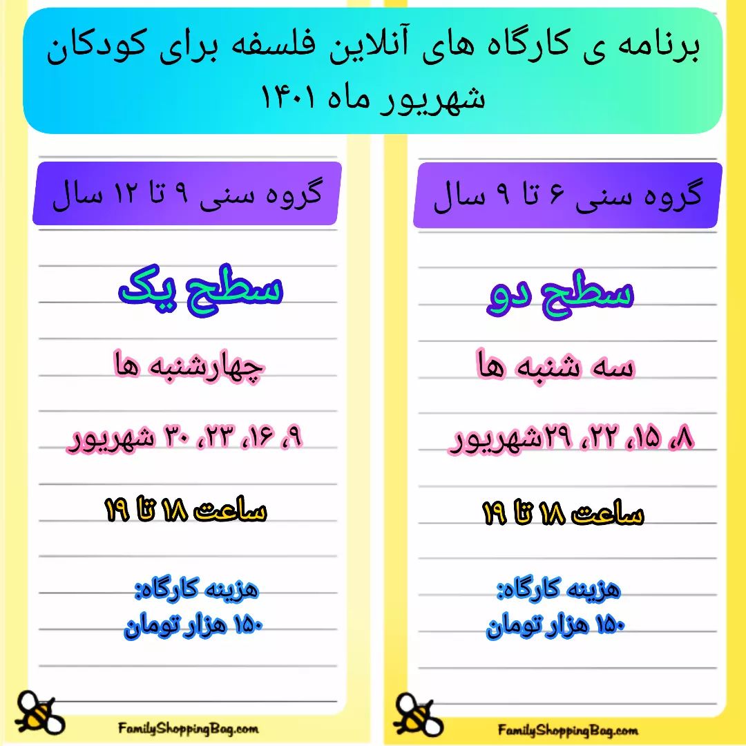 🛎برنامه ی کارگاه های شهریور ۱۴۰۱ 🛎 🏖 کارگاه ها به صورت آنلاین و یکبار در هفته برگزار می شوند. در دو گروه سنی ۶تا ۹ سال و ۹ تا ۱۲ سال. ⛔ظرفیت محدود . ⚠ جهت ثبت نام به دایرکت پیام دهید. . #کارگاه_فبک#کارگاه_فلسفه_برای_کودکان #کارگاه_کودکان