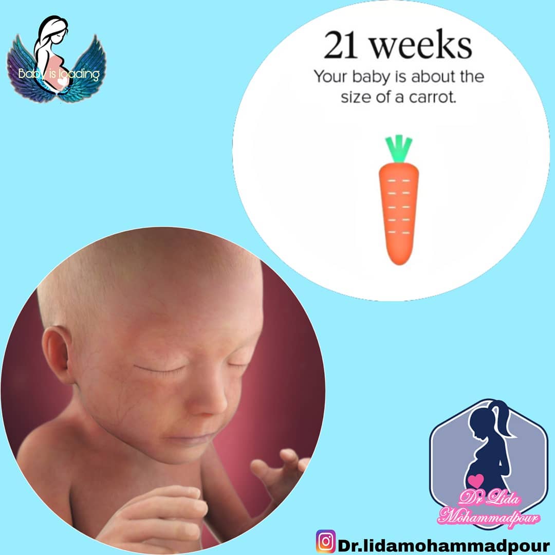 . #هفته_بیست_و_یکم_بارداری جنین اندازه هویج😍 در این سن حاملگی ابروهای جنین شما رشد کرده است ولی عنبیه چشم او هنوز فاقد رنگدانه است. در این هفته، شما مستعد ابتلا به واریس بارداری هستید، این عارضه بهاینعلت ایجاد میشود که حاملگی فشار بیشتری بر سیاهرگ پاهای شما وارد میکند. حجم خون در بدن شما افزایشیافته و رحم شما فشار بیشتری بر سیاهرگ بزرگ تحتانی (که خون را از اندامهای پایینی بدن شما به قلب بازمیگرداند) وارد میکند.از طرفی سطح بالاتر پروژسترون ، باعث شل شدن دیواره رگهای شما شود و می تواند مشکل را بدتر کند.می توانید جوراب واریس بپوشید. یک پیادهروی سریع در طول روز نیز میتواند با افزایش سرعت گردش خون به شما کمک کند. همچنین میتوانید به پهلوی چپ دراز بکشید و یک بالش زیر پاهای خود قرار دهید تا پاها بالاتر از سطح زمین قرار گیرند. برای راحتی بیشتر هنگام خوابیدن ، سعی کنید یک بالش بین پاهای خود قرار دهید. با پیشرفت بارداری ، مقداری تورم در انگشتان شما ایجاد می شود. اگر انگشتر دارید قبل از اینکه گیر کنند، آنهارا در آورید.می توانید با زنحیر بر گردنتان بیاویزید.