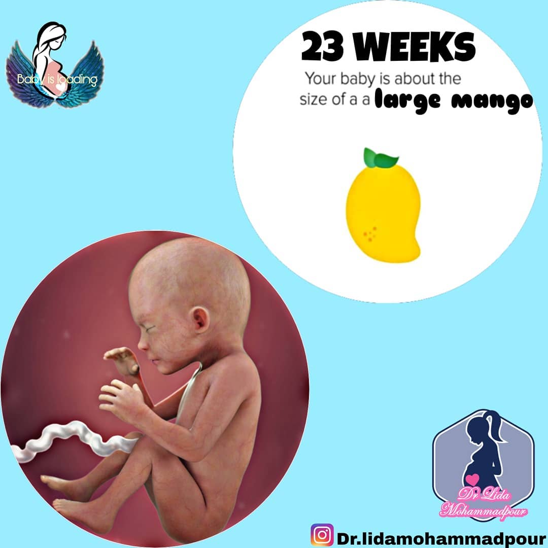 . #هفته_بیست_و_سوم_بارداری جنین اندازه انبه بزرگ😍 در این سن حاملگی وزن جنین شما احتمالاً به ۵۰۰ گرم یا اندکی بیشتر رسیده است، حدود ۳۰ سانتیمتر طول دارد و تقریباً به اندازه یک انبه بزرگ یا یک گریپ فروت است. از این به بعد، کودک شما بهطور جدی شروع به وزنگیری میکند. لانوگو (موهای نرم و لطیفی که عمده بخشهای بدن کودک را می پوشاند) ممکن است تیرهتر شود. ریهها نیز در حال تشکیل هستند. در هفته بیست و سوم بارداری حرکت کودک به اطراف بیشتر می شود. این حرکات بر اساس برنامه کودک تنظیم میشوند، نه برنامه شما! پس آماده باشید هنگامی که دراز میکشید و می خواهید بخوابید کودکتان شروع به رقصیدن کند! کودک شما اکنون می تواند صداهایی را از دنیای خارج از رحم مادر بشنود و صدای مردانه را با وضوح بیشتری نسبت به صدای زن می شنود. ناف شما که قبلاً رو به داخل بوده است، ممکن است طی این هفته ناگهان بیرون زده شود که پس از زایمان به حالت قبلی خود برمیگردد. اگر ترشحات واژینال شفاف یا زرد رنگ دارید که بوی خفیفی دارد، نگران نشوید؛ این اتفاق طبیعی است. با این حال اگر رنگ یا بوی این ترشحات تغییر قابل توجهی داشته باشد، ممکن است دچار عفونت شده باشید و باید با پزشک خود تماس بگیرید. رقص، ورزشی عالی در دوران بارداری است. شما را انعطاف پذیر نگه می دارد. با وجود خستگی نیز سعی کنید تمرینات ورزشی خود را انجام دهید تا به پیشگیری از کمردرد کمک کنید. همچنین برای جلوگیری از گرفتگی ماهیچههای پاها، هنگام نشستن، پاهایتان را روی هم نیندازید و با اجازۀ پزشکتان پیادهروی کنید. قبل از خوابیدن نیز اطمینان پیدا کنید که چیزی کنار تخت شما نباشد تا اگر شبها هنگام بلند شدن، زمین نخورید. برای جلوگیری از آسیب به جنین هنگام سفر با خودرو، موارد ایمنی را رعایت کنید. سعی کنید آب کافی به بدنتان برسانید، زیرا آب کافی کمک خواهد کرد که از سردرد، درد عضلات رحم و عفونتهای مجاری ادرار جلوگیری شود. ماهی سالمون به رشد مغز جنین کمک می کند. آووکادو به جلوگیری از گرفتگی پا کمک می کند،پس مصرفشان را فراموش نکنید.