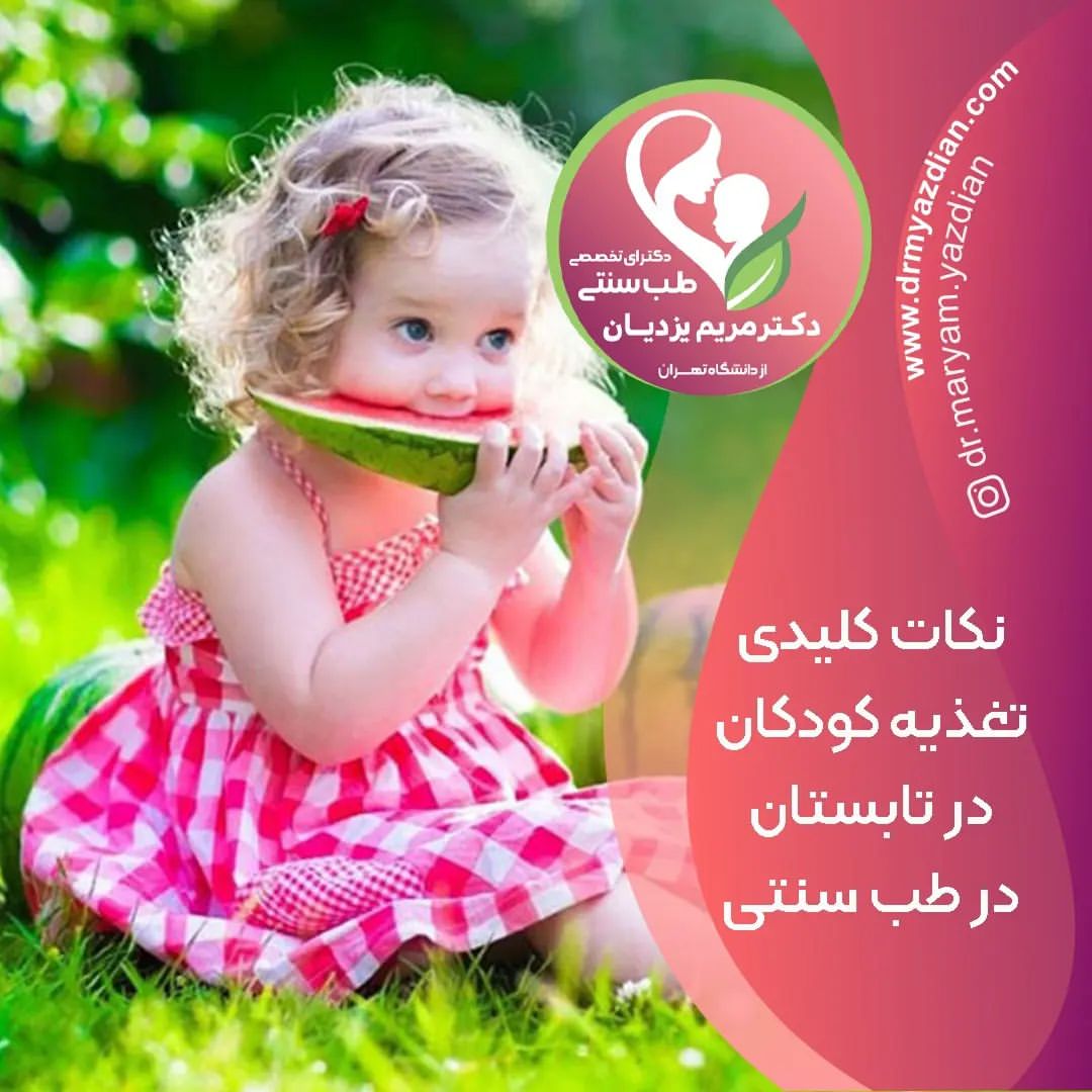 ♦️تغذیه تابستانی کودک♦️ ✅از نظر طب سنتی مقداری کاهش اشتها در فصل تابستان کاملا طبیعی است. ☝️با توجه به مزاج گرمتر کودکان نسبتا به بزرگسالان، بی اشتهایی در کودکان در تابستان شیوع بالایی دارد. 😔 ☝️☝️ عایت توصیه های تغذیه ای بیان شده در اسلاید ها به کاهش مشکلات گوارشی کودکان در تابستان کمک می کند. ❣️نکات علمی طب ایرانی در ویدیوهای جامع " کودک سالم در طب سنتی" و " تغذیه کودک سالم در طب سنتی" ✨✨ برای تهیه ویدئو ها به آدرس سایت 👇👇👇 www.drmyazdian.com مراجعه کنید ✨✨✨ و یا در دایرکت پیام بدین.🌸🌸 __________________________________________ ⏪برای تهیه ویدیوهای آموزشی جامع و کاربردی طب سنتی ♦ سلامت و تغذیه کودکان ♦ پیش از باداری سالم ♦ بارداری سالم ♦ پس از زایمان و شیردهی ♦عفونت زنان ♦یایسگی و یایسگی زودرس ♦سلامت رحم و تخمدان ♦سلامت معده و کبد ♦مزاج شناسی ♦و سایر ویدیوهای سلامت کودکان و بانوان به سایت زیر مراجعه کنید 👇👇👇👇 www.drmyazdian.com 👈یا در دایرکت پیام بدین 👈لینک سایت در بیو و های لایت موجود است. ⏪ویدیوها ویژه عموم بانوان و همکاران گروه علوم پزشکی می باشند. _________________________________________ 💠دکتر مریم یزدیان 💠 فارغ التحصیل پزشکی عمومی از دانشگاه تهران 💠دکترای تخصصی طب سنتی از دانشگاه علوم پزشکی تهران 💠رتبه دوم آزمون ورودی طب سنتی کشوری 💠 مدرس دوره های طب سنتی مقدماتی تا پیشرفته برای گروههای مدارس،جهاد دانشگاهی،پزشکان و ماماها به امید 🔆 مادران سالم 🔆 کودکان سالم 🔆جامعه سالم @dr.maryam.yazdian @dr.maryam.yazdian @dr.maryam.yazdian __________________________________________