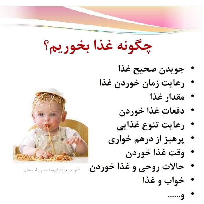 غذا: در بحث غذا اکثر افراد به دنبال دانستن غذای مناسب برای خود هستند. چه گوشتی؟ چه میوه ای؟ چه برنجی؟ چه سبزی ای؟ چه .........؟؟؟؟ اما غافل از آنکه * چگونه* خوردن غذا از نوع غذای مصرفی میتواند مهم تر باشد... چه بسا بهترین نوع غذا را اگر به روش غلطی مصرف کنیم اثر سوئی بر بدن خواهد گذاشت و چه بسا مصرف صحیح غذایی نامناسب می تواند اثرات سو آن را به مراتب کاهش دهد.... پس از امروز غذا را درست بخوریم!! #طب_سنتی #طب_ایرانی #انجمن_علمی_طب سنتی #زندگی_ سالم #غذای _سالم #هضم _غذا #خوردن #آشامیدن #آب #سلامتی #تندرستی #سبک_زندگی #زندگی_بهتر #چاقی #اضافه وزن #مزاج #طبع