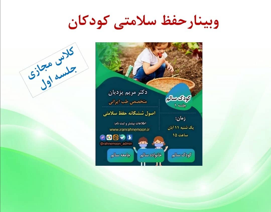 🌸کلاس آنلاین حفظ سلامتی کودکان🌸 🌼 چگونه با دانستن اصول ساده کودکان سالم داشته باشیم و از بیماری پیشگیری کنیم؟ 🌱 جلسه اول : اصول ششگانه حفظ سلامتی کودکان در طب سنتی ایران ⭐️ اصول تغذیه سالم در کودکان ⭐️ خواب مناسب و آثار آن در رشد و سلامت اطفال ⭐️ آثار تحرک مناسب در سلامت کودکان ⭐️ تاثیر حالات روحی در سلامت اطفال ⭐️ آثار نامناسب یبوست مزاج در سلامت کودکان ⬅️ مخاطبان کارگاه: والدین گرامی، مربیان عزیز، و تمامی علاقمندان به حوزه کودک ✅ دکتر مریم یزدیان متخصص طب ایرانی ⏰ زمان : یکشنبه ۱۱ آبان ساعت ۱۵ #زندگی_سالم #سلامتی #خوردنی #مزاج #غذای_سالم #طب_سنتی #طب_ایرانی #سلامتی #تندرستی #طب_ایرانی #وبینار_آنلاین #وبینار_طب_سنتی #کودکان