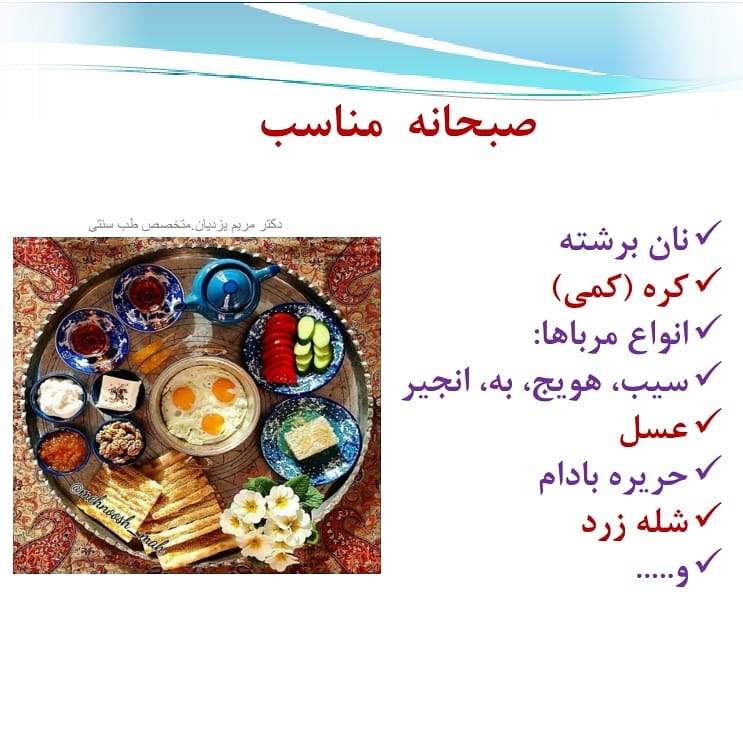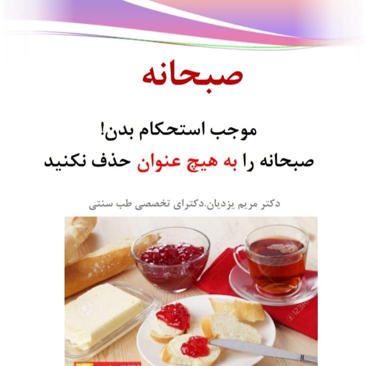 خوردن صبحانه میخ بدن است! (بدن را نیرومند میکند) لقمه الصباح مسمار البدن بهتراست صبحانه حوالی طلوع آفتاب میل شود. متاسفانه برخی به دلیل مشغله و یا حتی کاهش وزن از خوردن وعده باارزش صبحانه غافل می شوند. حال انکه خوردن صبحانه به تقویت بدن و افزایش متابولیسم در دراز مدت کمک میکند. اگر علت صبحانه نخوردن شما بی اشتهایی است باید درمان بگیرید. 👈بفرمایید روزهایی که صبحانه میل میکنید چه تفاوتی با روزهای دیگه حس میکنید؟ 💠برای آموزش صحیح مطالب از اول پیچ مطالب رو مطالعه بفرمایین. مطالب به ترتیب قرار داده شده است سالم و تندرست باشید🌿 #طب_سنتي #طب_ایرانی #زندگی_ سالم #غذای _سالم #خوردنی #سلامتی #تندرستی #سبک_زندگی_سالم #مزاج #صبحانه