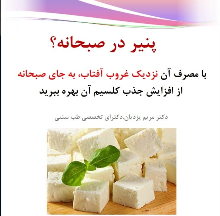 از مصرف پنیرهای خامه ای اجتناب کنید. از لقمه نان و پنیر گوسفندی را به عنوان میان وعده عصرگاهی نزدیک غروب آفتاب لذت ببرید تا بدن شما کلسیم بیشتری را جذب کند. 💠برای آموزش صحیح مطالب از اول پیچ مطالب رو مطالعه بفرمایین. 🌺مطالب به ترتیب قرار داده شده است سالم و تندرست باشید🌿 #زندگی_سالم #سلامتی #خوردنی #مزاج #غذای_سالم #طب_سنتی #طب_ایرانی #سلامتی #تندرستی #طب_ایرانی #پنیر #صبحانه