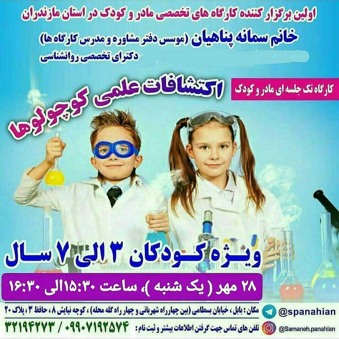 💞کارگاه تک جلسه ای مادر و کودک 🔮 اکتشافات علمی کوچولوهای ۳ الی ۷ ساله یک شنبه ( ۲۸ مهر ) ، ساعت ۱۵:۳۰ الی ۱۶:۳۰ 🌟 هزینه: ۲۸ هزار ☎️09907192574 32194273 @samaneh.panahian #اکتشافات_علمی_کوچولوها #سمانه_پناهیان #روانشناس_کودک #اولین_برگزارکننده_کارگاههای_تخصصی_مادروکودک_در_استان_مازندران #دارنده_مجوز_رسمی_از_سازمان_نظام_روانشناسی #کارگاه_مادروکودک_مازندران #کارگاهمادروکودک