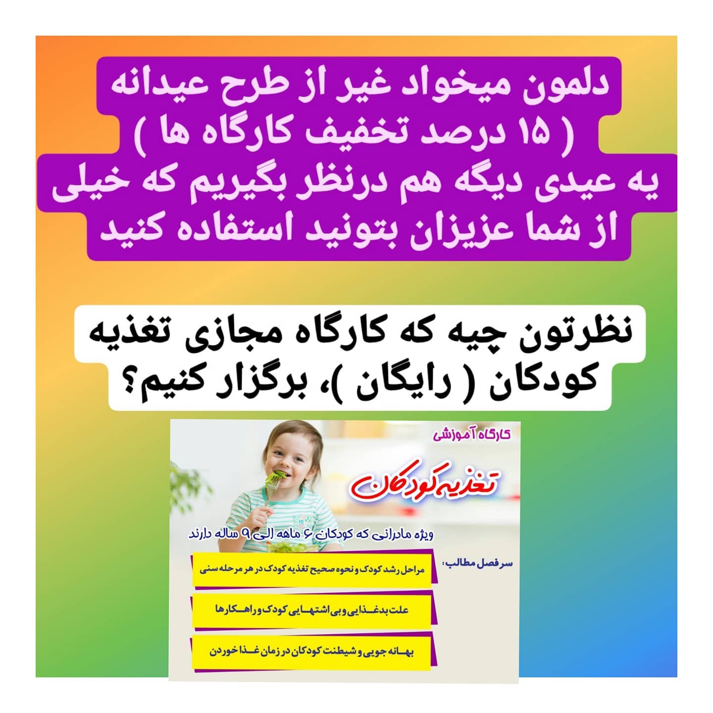 👆یک کارگاه جذاب دیگه رنگ بازی ✨ویژه گروه سنی ۱ الی ۲/۵ سال✨ 💚 کلیه رنگ ها👈 خوراکی 🔷زمان: ۲۴مهر(سه شنبه )، ساعت۱۶:۳۰ الی ۱۷:۳۰ 🔷هزینه: ۲۸ هزارتومان 09907192574 32194273 مازندران،بابل،خ بسطامی، نیایش۸، حافظ۳، پلاک ۲۰ @samaneh.panahian @samaneh.panahian @samaneh.panahian #کارگاهمادروکودک #مازندران_بابل #رنگ_بازی #سمانه_پناهیان#روانشناس_کودک#اولین_برگزارکننده_کارگاه_های_تخصصی_مادروکودک_در_استان_مازندران #مادروکودک#بازی#هیجان#شادی#مازندران#بابل