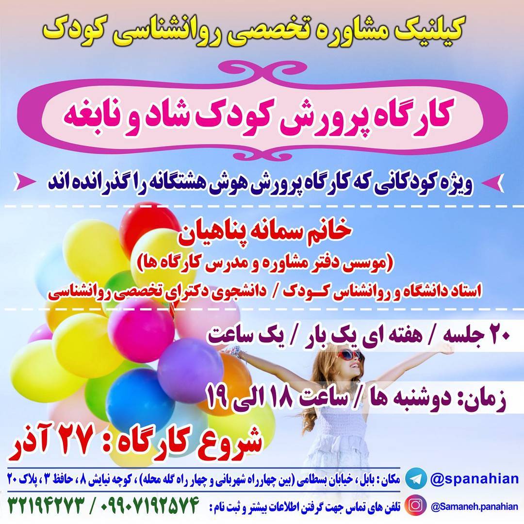 ورق بزنید😊 💕اطلاعیه دوره های جدیدی که در حال حاضر ظرفیت داره💕 ثبت نام از طریق👇 ⭐️دایرکت ⭐️تلفنی ⭐️حضوری 💕مازندران، بابل، کمربندی شرقی، گلستان۱۵، کمیل غربی۹، روبروی مدرسه جابربن حیان، جنب درب پشتی دانشگاه تربیت معلم، مجموعه تخصصی روانشناسی کودک و نوجوان دکتر سمانه پناهیان💕 ☎️ 09907192574 #دکتر_سمانه_پناهیان #روانشناس_کودک_نوجوان #اولین_برگزارکننده_کارگاه_های_تخصصی_مادروکودک_در_استان_مازندران #شادونابغه #قندوعسل #فرشته_کوچولوها #کثیف_کاری #تخلیه_هیجانی #دنیای_رنگهاوشکلها #اتل_متل_موسیقی #موسیقی #بازیهای_ریتمیک #هوش_هشتگانه #ورجه_وورجه #بازیهای_حرکتی_هدفمند #بازی_شغلها #استعدادیابی #کودکان #نوجوانان #یوگا_کودکان #مهارتهای_زندگی #اعتمادبهنفس #فن_بیان #مادروکودک #دقت_و_تمرکز #مادروکودک #مادروکودک_بابل #فلسفه_کودک #فبک #فبک_فلسفه_برای_کودکان_و_نوجوانان