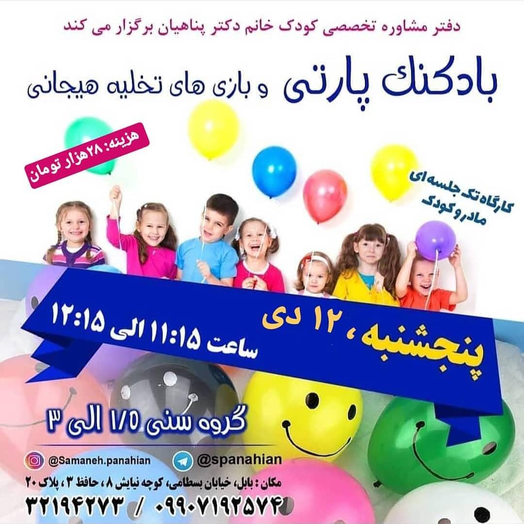 🥰باتوجه به استقبال عزیزان، سانس سوم بادکنک پارتی نیز در نظر گرفته شد👌 🎈🎈 ظرفیت محدود🎈🎈 هزینه: ۲۸ هزار تومان شماره های تماس جهت رزرو: ☎️09907192574 32194273 @samaneh.panahian #دکتر_سمانه_پناهیان #روانشناس_کودک #اولین_برگزارکننده_کارگاههای_تخصصی_مادروکودک_در_استان_مازندران #دارنده_مجوز_رسمی_از_سازمان_نظام_روانشناسی_و_مشاوره_کشور