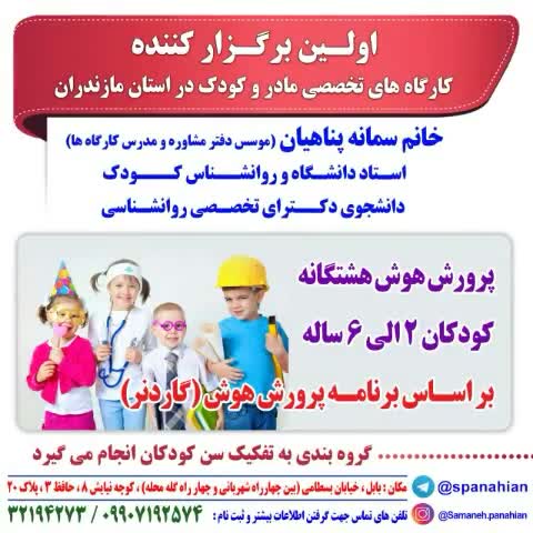 دکتر سمانه پناهیان/ روانشناس کودک و نوجوان اولین برگزار کننده کارگاه های مادر و کودک در استان مازندران آغاز فعالیت از سال 88 مازندران، بابل، کمربندی شرقی، گلستان 15، مجموعه تخصصی روانشناسی کودک و نوجوان