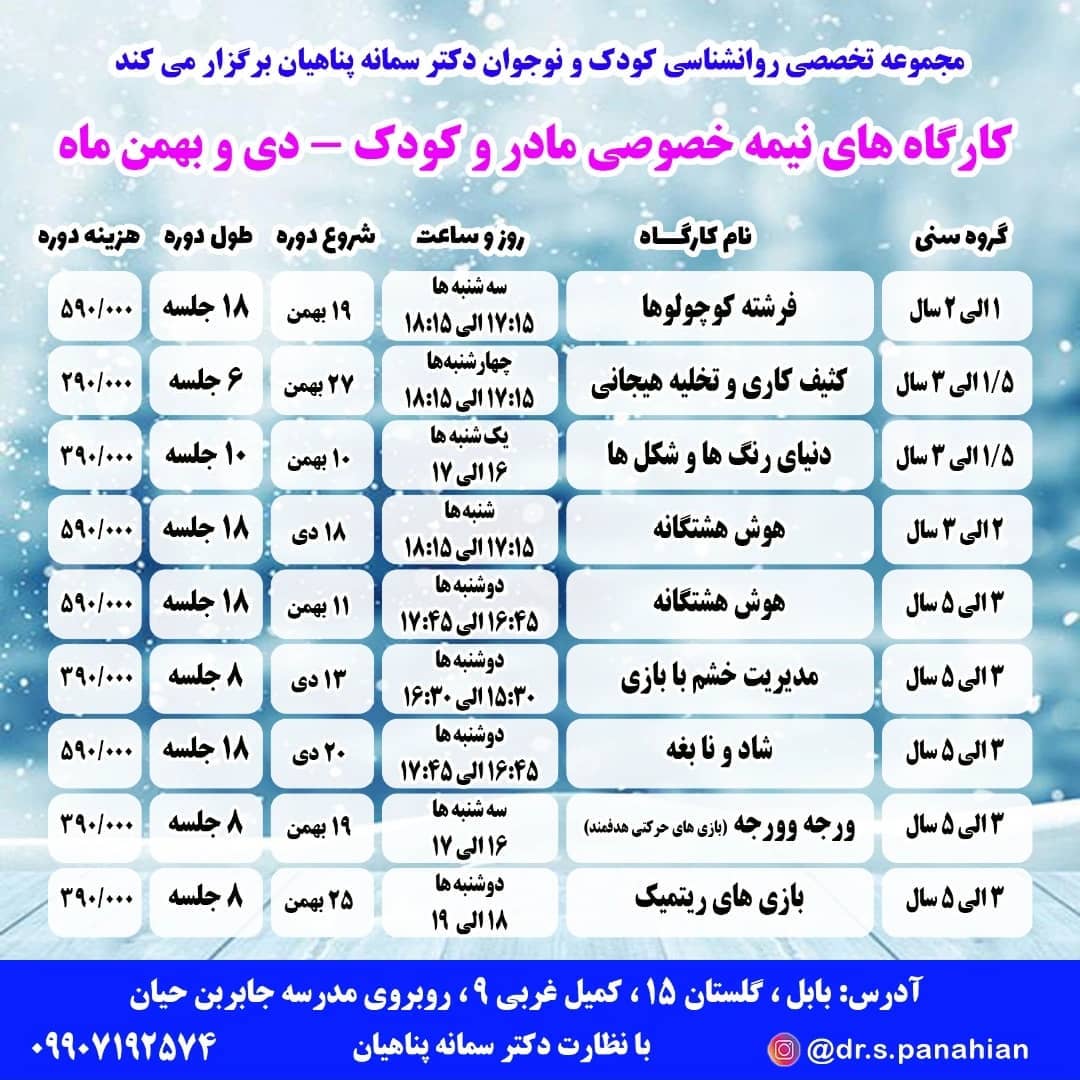 دکتر سمانه پناهیان/ روانشناس کودک و نوجوان اولین برگزار کننده کارگاه های مادر و کودک در استان مازندران آغاز فعالیت از سال 88 مازندران، بابل، کمربندی شرقی، گلستان 15، مجموعه تخصصی روانشناسی کودک و نوجوان
