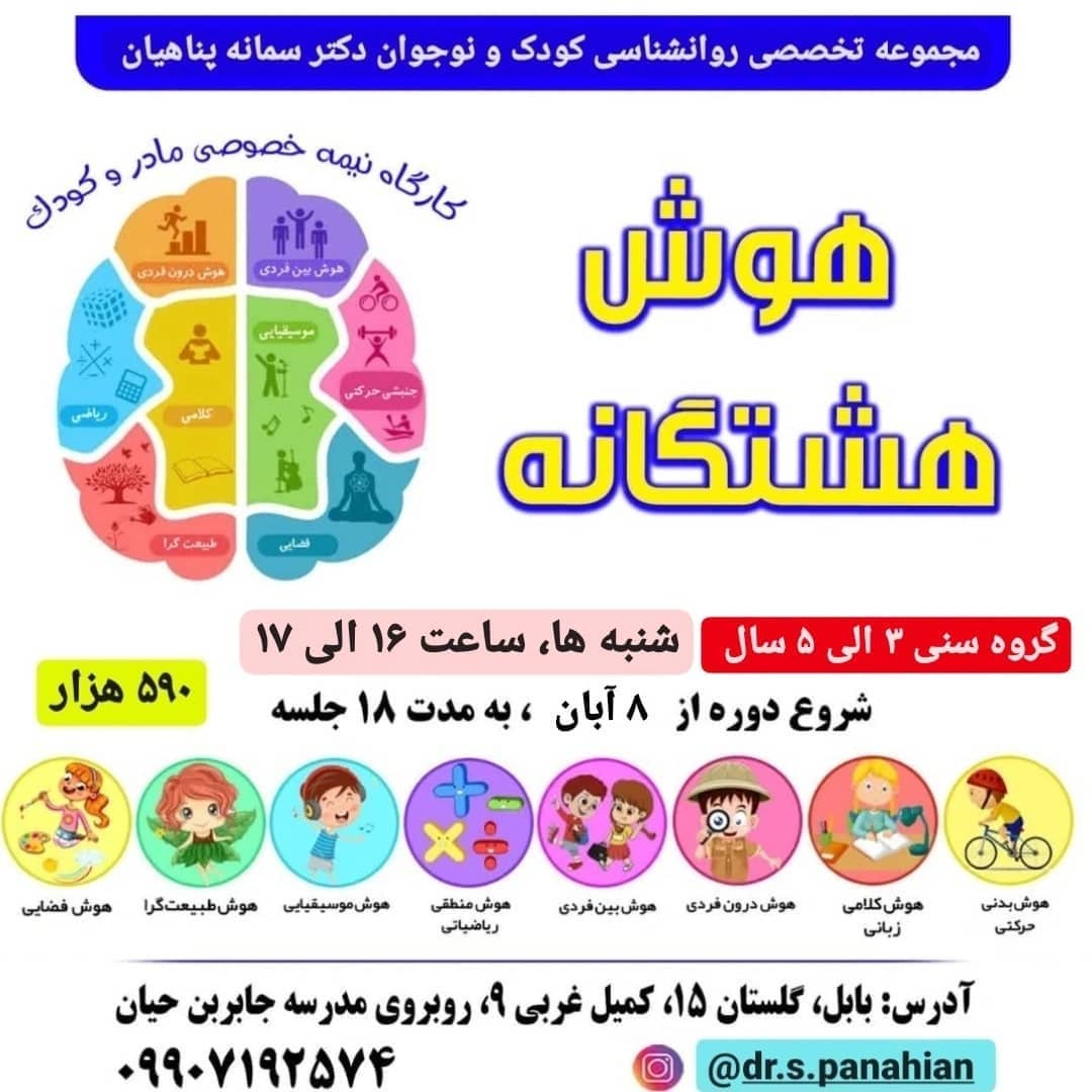 😍 کارگاه بازیگوش باهوش" (جدائی اصولی و تدریجی کودک از مادر) 📝 هفته ای دو بار و هر جلسه دو ساعت 💠شنبه ها و چهار شنبه ها، ساعت ۱۰:۳۰ الی ۱۲:۳۰ گروه سنی ۲/۵ الی ۴/۵ سال 🔺مازندران، بابل، خیابان بسطامی، نیایش ۸، حافظ ۳، پلاک ۲۰، دفتر مشاوره تخصصی کودک خانم دکتر پناهیان ☎️ شماره های تماس جهت ثبت نام: 09907192574 32194273 @samaneh.panahian