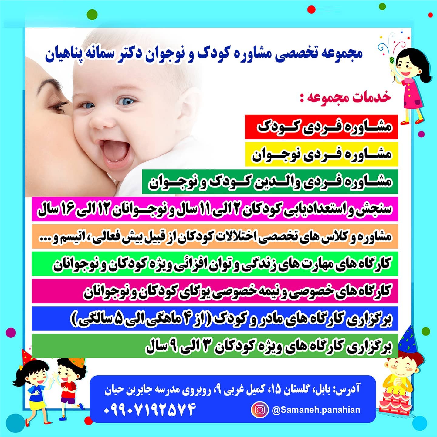 دکتر سمانه پناهیان/ روانشناس کودک و نوجوان اولین برگزار کننده کارگاه های مادر و کودک در استان مازندران آغاز فعالیت از سال 88 مازندران، بابل، کمربندی شرقی، گلستان 15، مجموعه تخصصی روانشناسی کودک و نوجوان