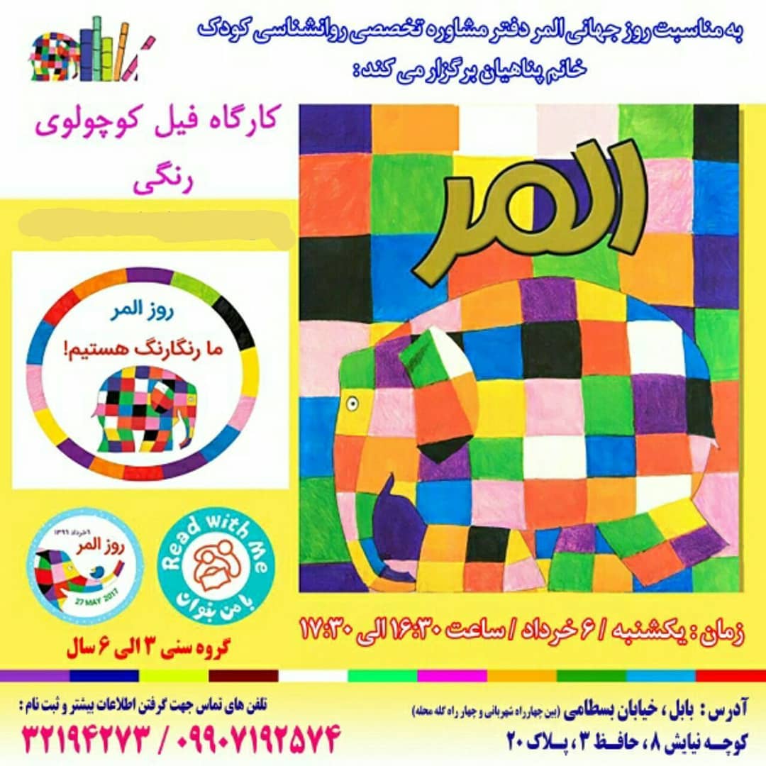 😍کارگاهی متفاوت و جذاب به مناسبت روز جهانی المر ❣قراره کودکان ۳ الی ۶ ساله در این روز لباس های رنگی خودشون رو بپوشن و فعالیت های جالب و جذاب انجام بدن 🌟هدف کارگاه: پرورش احساس ارزشمندی ❇️ پس از تکمیل ظرفیت، از پذیرش معذوریم. @samaneh.panahian #روز_جهانی_المر #ما_رنگارنگ_هستیم #کتاب #المر #ElmerDay