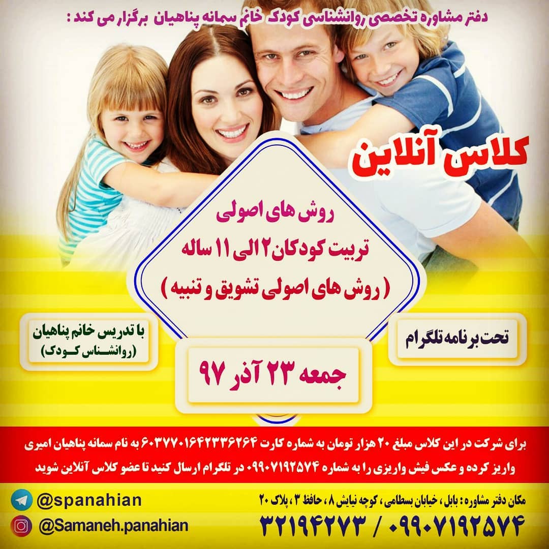 🎊خبر خوب برای والدین گرامی 👇 😍کلاس آنلاین روش های اصولی تربیت کودکان ۲ الی ۱۱ ساله ( روش های اصولی تشویق و تنبیه ) 🔷 کلاس در روز جمعه ۲۳ آذر ساعت ۱۲ الی ۱۳ در برنامه تلگرام برگزار می شود مطالب بصورت تایپ شده به زبان گفتاری در کانالی که مخصوص این کلاس ایجاد می گردد درج می شود. در ضمن نیازی نیست اون ساعت حتما آنلاین باشید اطلاعات برای همیشه باقی می ماند. مطالب کلاس کاملا شفاف و واضح و ۱۰۰ درصد کاربردی و مفید خواهد بود برای پرسش و پاسخ هم آی دی گذاشته می شود تا سوالات خود را بپرسید😊 ✨ برای شرکت در این کلاس مبلغ ۲۰ هزار تومان به شماره کارت ۶۰۳۷۷۰۱۶۴۲۳۳۶۲۶۴ به نام سمانه پناهیان امیری واریز کرده و عکس فیش واریزی را به شماره 09907192574 در تلگرام ارسال کنید تا عضو کلاس شوید. ☎️09907192574 32194273 @samaneh.panahian @samaneh.panahian #سمانه_پناهیان #روانشناس_کودک #کلاس_آنلاین #آموزش #دفتر_مشاوره_تخصصی_روانشناسی_کودک_خانم_پناهیان #کارگاه_مادروکودک_مازندران #مادروکودک #مازندران_بابل