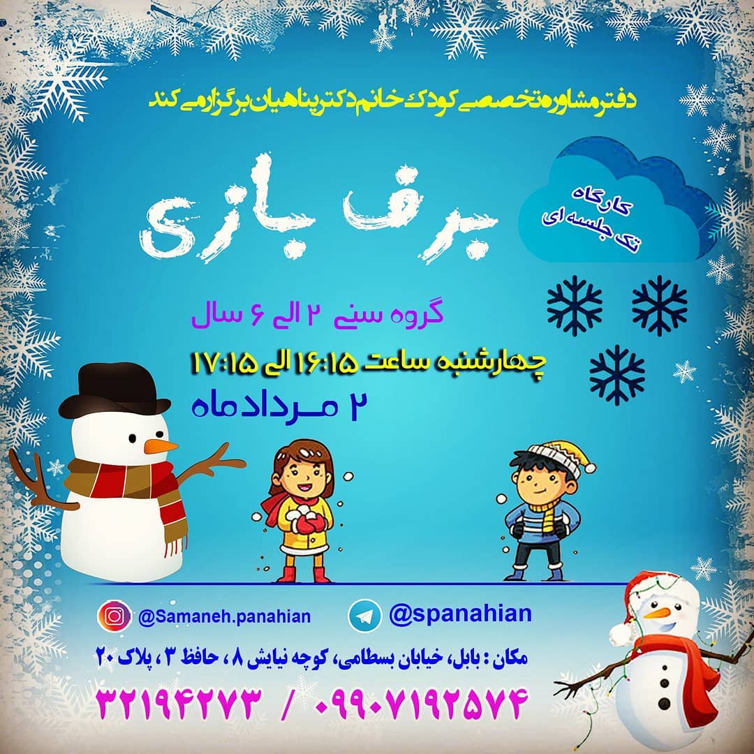 ۲ نفر ظرفیت دارد👌 😍کارگاه تک جلسه ای برف بازی ، مادر و کودک⛄❄ ☎️0990719257 32194273 🕟 ۲ مرداد ، ساعت ۱۶:۱۵ الی ۱۷:۱۵ هزینه مادر و کودک : ۲۸ هزار @samaneh.panahian @samaneh.panahian @samaneh.panahian #برف_بازی #کارگاهمادروکودک #سمانه_پناهیان #اولین_برگزارکننده_کارگاههای_تخصصی_مادروکودک_در_استان_مازندران #دفتر_مشاوره_تخصصی_روانشناسی_کودک_خانم_پناهیان #مادر_و_کودک_۲تا۶_سال #مادر_و_کودک #مازندران #بابل