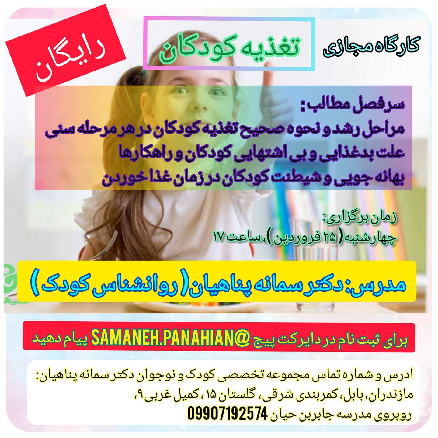دکتر سمانه پناهیان/ روانشناس کودک و نوجوان اولین برگزار کننده کارگاه های مادر و کودک در استان مازندران آغاز فعالیت از سال 88 مازندران، بابل، کمربندی شرقی، گلستان 15، مجموعه تخصصی روانشناسی کودک و نوجوان