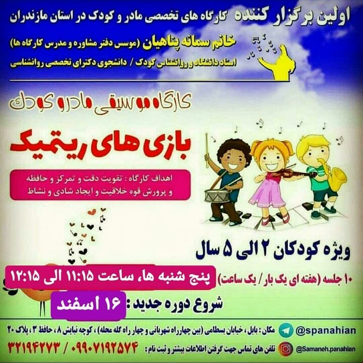 ✨یک نفر ظرفیت دارد✨ 🌟 کارگاه موسیقی مادر و کودک (بازی های ریتمیک بابل،خ بسطامی،نیایش۸، حافظ۳، پلاک ۲۰ ☎️ جهت ثبت نام👇 09907192574 - 32194273 @spanahian @spanahian