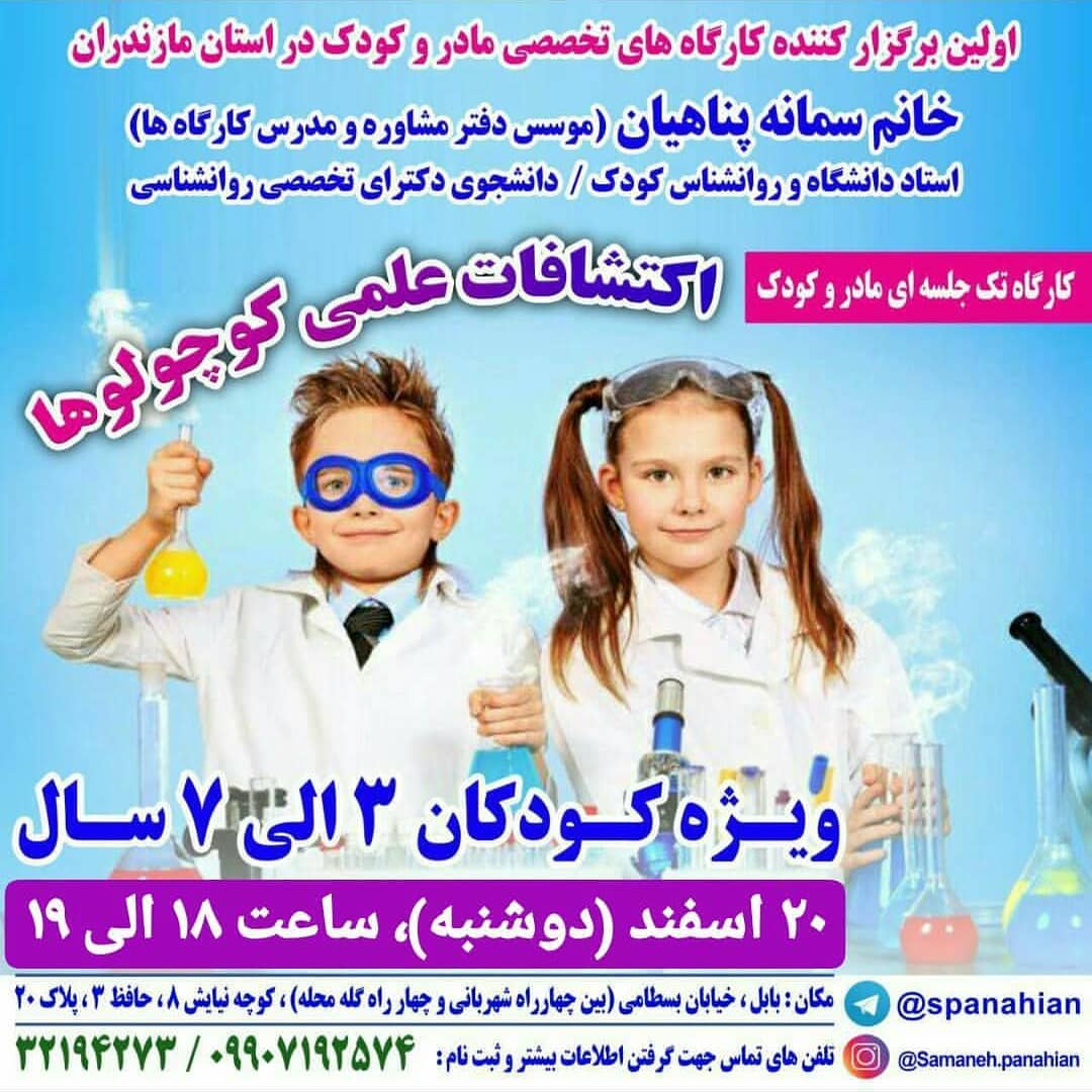 💞کارگاه تک جلسه ای مادر و کودک 🔮 اکتشافات علمی کوچولوهای ۳ الی ۷ ساله 📆 دوشنبه ( ۲۰ اسفند )، ساعت ۱۸ الی ۱۹ 🛡 هزینه: ۲۸ هزار ☎️09907192574 32194273 @samaneh.panahian #اکتشافات_علمی_کوچولوها #سمانه_پناهیان #روانشناس_کودک #اولین_برگزارکننده_کارگاههای_تخصصی_مادروکودک_در_استان_مازندران #دارنده_مجوز_رسمی_از_سازمان_نظام_روانشناسی #کارگاه_مادروکودک_مازندران #کارگاهمادروکودک #سه_ساله #چهارساله #پنج_ساله #شش_ساله #هفت_ساله #مازندران_بابل