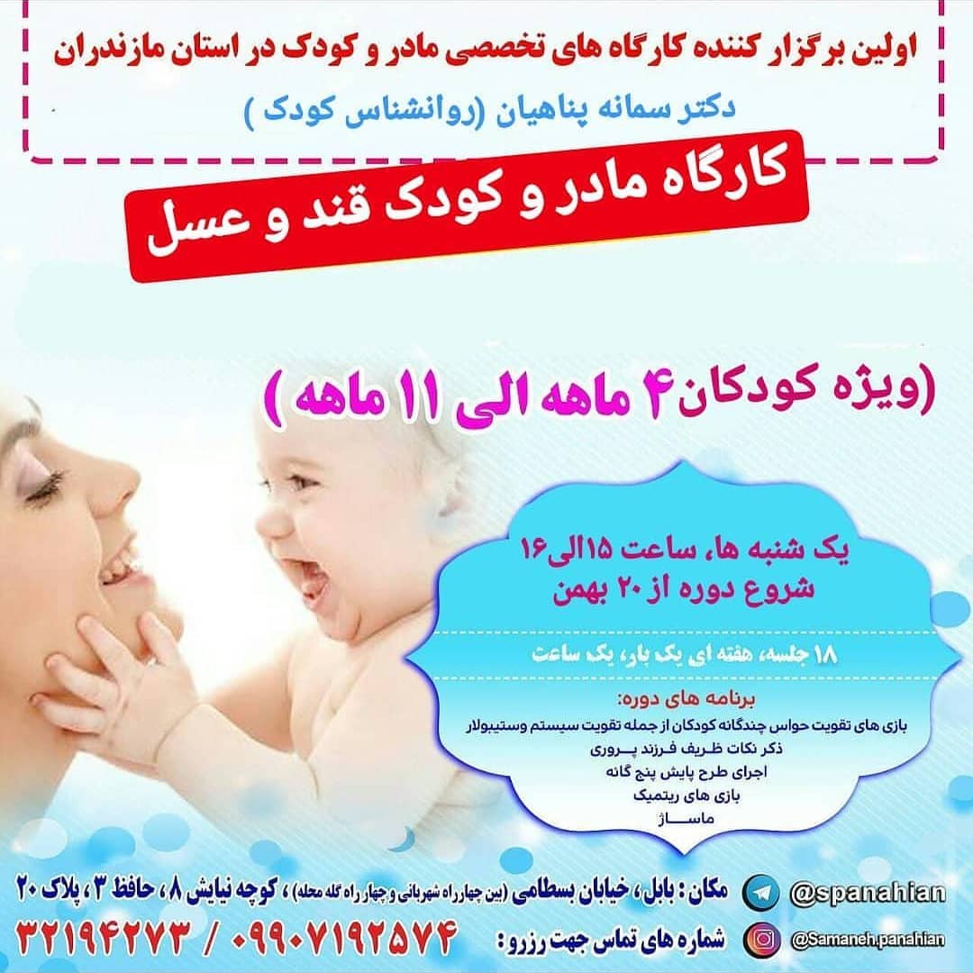😍 کارگاه قند و عسل ( پرورش حواس و هوشیاری کودکان ۴ الی ۱۱ ماه ) 🌸شروع دوره جدید از ۲۰ بهمن ماه 💠 مازندران، بابل، خیابان بسطامی، کوچه نیایش۸، حافظ۳، پلاک ۲۰، دفتر مشاوره تخصصی کودک خانم دکتر پناهیان ☎️09907192574 32194273 @samaneh.panahian #دکتر_سمانه_پناهیان #روانشناس_کودک #اولین_برگزارکننده_کارگاههای_تخصصی_مادروکودک_دراستان_مازندران #دارنده_مجوز_رسمی_از_سازمان_نظام_روانشناسی_و_مشاوره_کشور