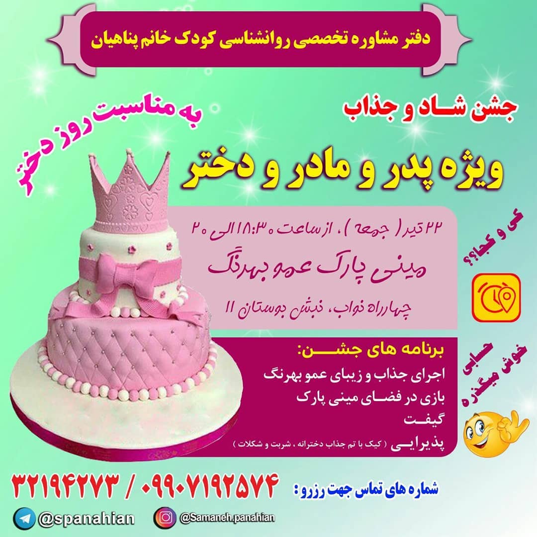 🎀 آخرین مهلت رزرو جشن روز دختر، تا فردا ( چهارشنبه ، ۲۰ تیر )، ساعت ۱۹ ☎️شماره های تماس جهت رزرو: 👇 32194273 09907192574