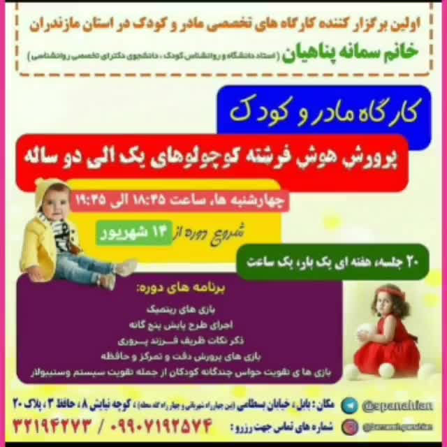 ❇️ کارگاه تخصصی مادر و کودک 👼پرورش هوش فرشته کوچولوهای یک الی دو ساله ❇️ شروع دوره جدید:👇 چهارشنبه ها،ساعت ۱۸:۴۵ الی ۱۷:۴۵ @samaneh.panahian @samaneh.panahian #کارگاه_مادروکودک_مازندران_بابل #سمانه_پناهیان#روانشناس_کودک#اولین_برگزارکننده_کارگاه_های_تخصصی_مادروکودک_در_استان_مازندران #مادروکودک#یک_ساله#دو_ساله#هوش#پرورش#تقویت #توانمندی#کارگاه#بازی#هیجان#شادی#آموزش#مازندران#بابل