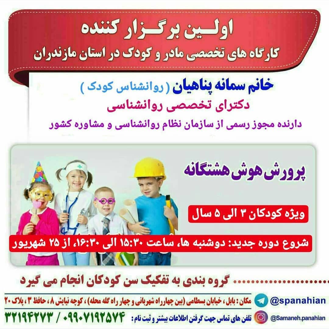 دکتر سمانه پناهیان/ روانشناس کودک و نوجوان اولین برگزار کننده کارگاه های مادر و کودک در استان مازندران آغاز فعالیت از سال 88 مازندران، بابل، کمربندی شرقی، گلستان 15، مجموعه تخصصی روانشناسی کودک و نوجوان