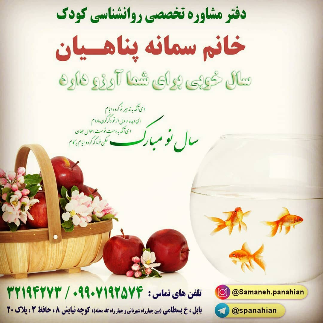 دکتر سمانه پناهیان/ روانشناس کودک و نوجوان اولین برگزار کننده کارگاه های مادر و کودک در استان مازندران آغاز فعالیت از سال 88 مازندران، بابل، کمربندی شرقی، گلستان 15، مجموعه تخصصی روانشناسی کودک و نوجوان