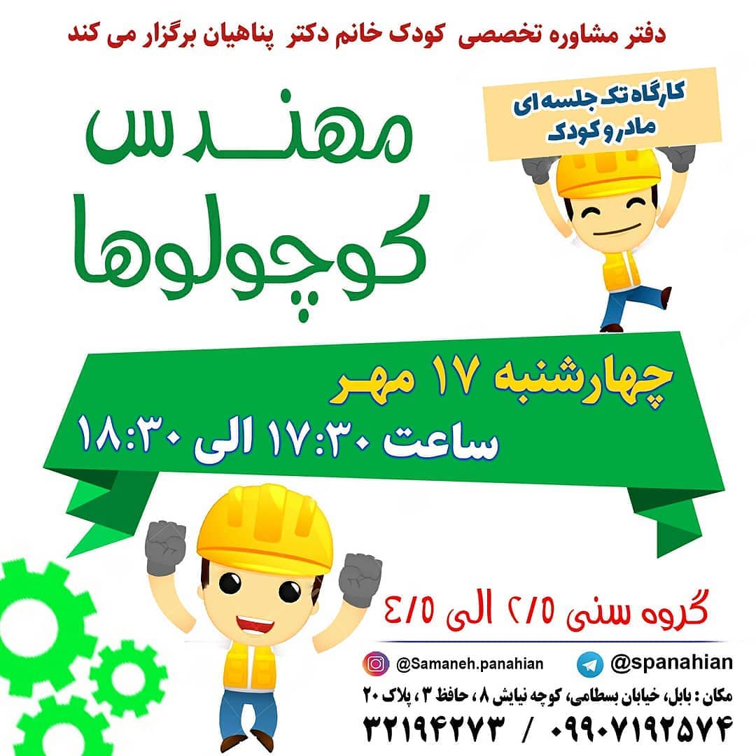 😃👌کارگاه تک جلسه ای مهندس کوچولوها👌 🌟ویژه کودکان ۲/۵ الی ۴/۵سال🌟 🎆بچه ها قراره در کنار مامانا یک ساعت ساخت و ساز های جذاب و مفید انجام بدن و کلی خوش بگذرونن🎆 هزینه : ۲۸ هزار شماره های تماس جهت رزرو: ☎️09907192574 32194273 @samaneh.panahian