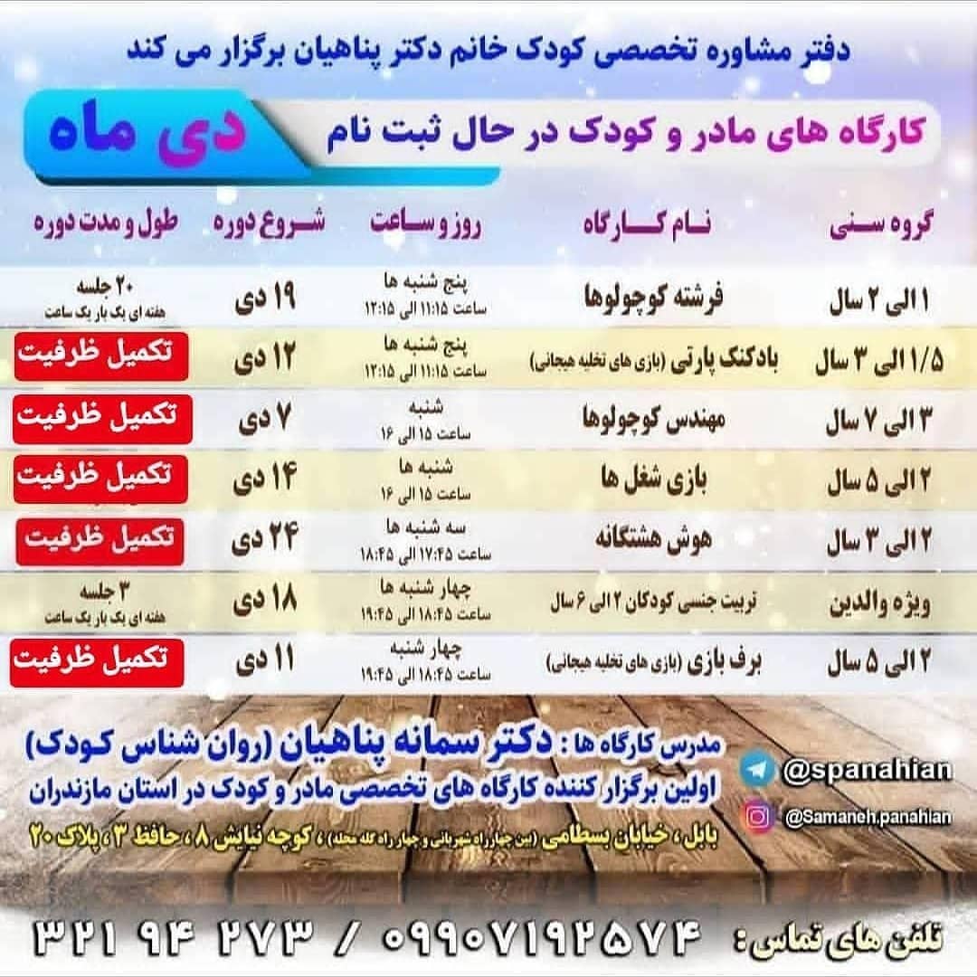 💕 کارگاه های دارای ظرفیت دی، بهمن و اسفندماه👌 ❇ شماره های تماس جهت گرفتن اطلاعات بیشتر و ثبت نام: ☎️09907192574 32194273 @samaneh.panahian #دکتر_سمانه_پناهیان #روانشناس_کودک #اولین_برگزارکننده_کارگاههای_تخصصی_مادروکودک_در_استان_مازندران #دارنده_مجوز_رسمی_از_سازمان_نظام_روانشناسی_و_مشاوره_کشور