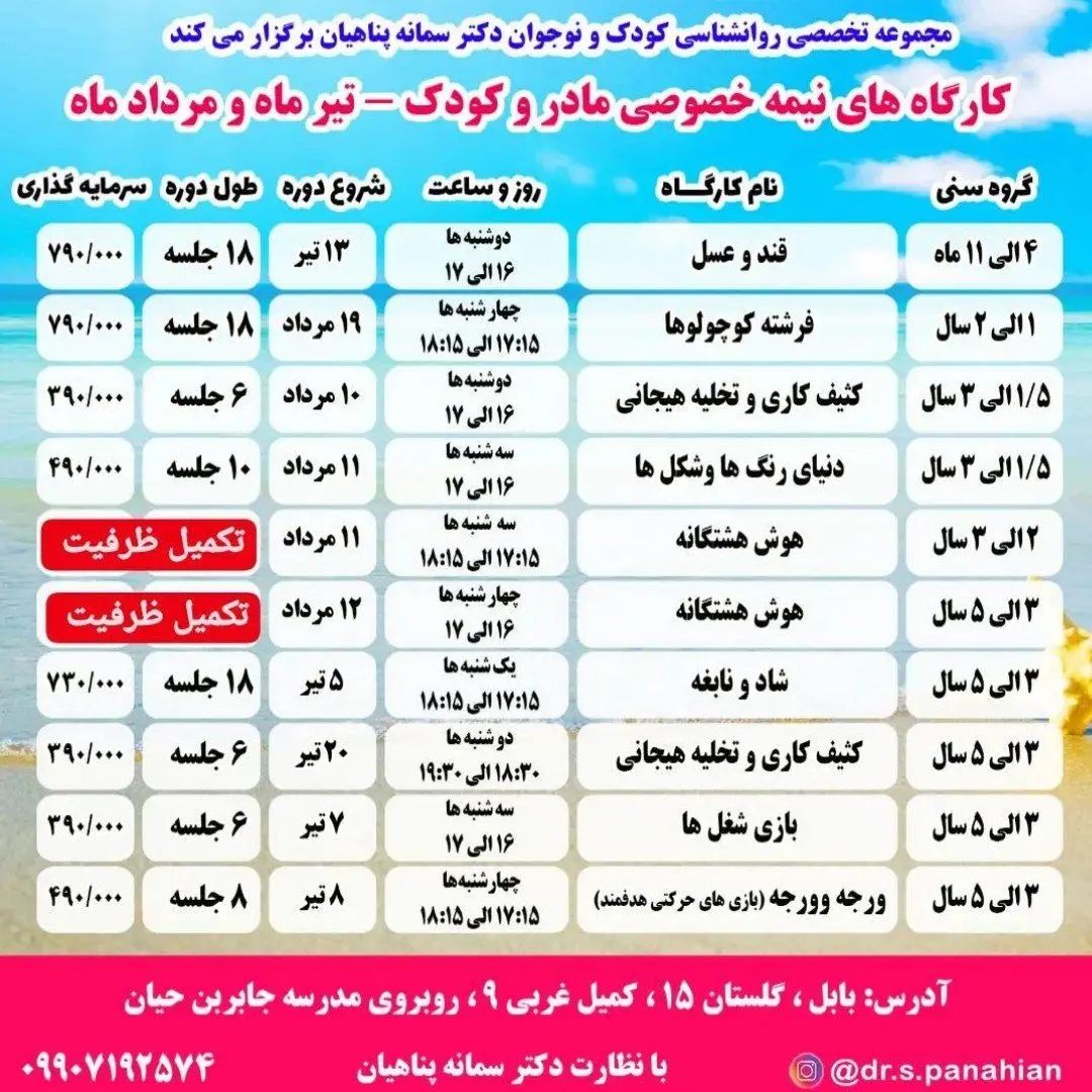 همه کارگاه های تیر و مرداد تکمیل ظرفیت شده 💕مازندران، بابل، کمربندی شرقی، گلستان۱۵، کمیل غربی۹، روبروی مدرسه جابربن حیان، جنب درب پشتی دانشگاه تربیت معلم، مجموعه تخصصی روانشناسی کودک و نوجوان دکتر سمانه پناهیان💕 ☎️ 09907192574 #دکتر_سمانه_پناهیان #روانشناس_کودک_نوجوان #اولین_برگزارکننده_کارگاه_های_تخصصی_مادروکودک_در_استان_مازندران #شادونابغه #قندوعسل #فرشته_کوچولوها #کثیف_کاری #تخلیه_هیجانی #دنیای_رنگهاوشکلها #اتل_متل_موسیقی #موسیقی #بازیهای_ریتمیک #هوش_هشتگانه #ورجه_وورجه #بازیهای_حرکتی_هدفمند #بازی_شغلها #استعدادیابی #کودکان #نوجوانان #یوگا_کودکان #مهارتهای_زندگی #اعتمادبهنفس #فن_بیان #مادروکودک #دقت #تمرکز #دقت_و_تمرکز #مادروکودک #مادروکودک_بابل