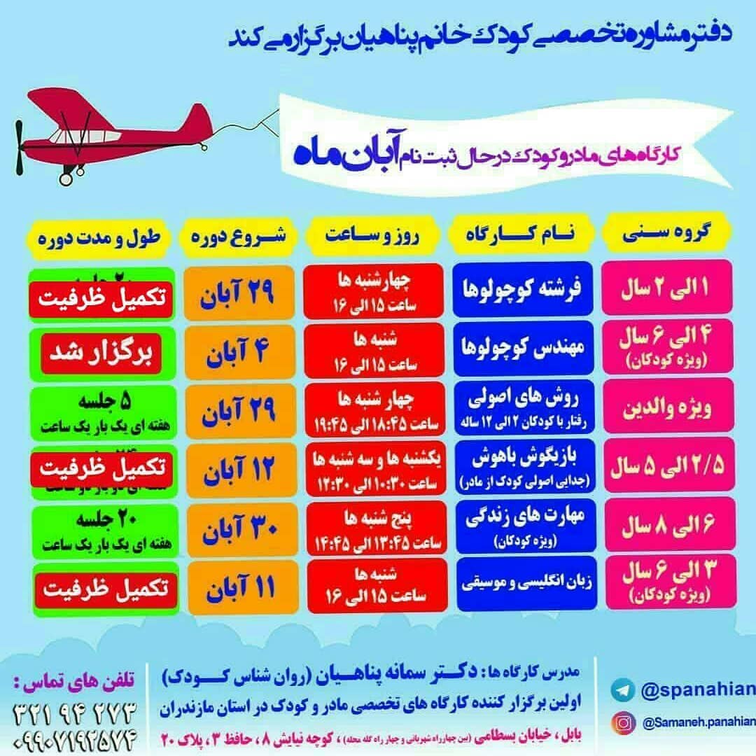 ورق بزنید😃 💖 آخرین بروز رسانی: ۱۱ آبان ✨کارگاه های دارای ظرفیت آبان، آذر و دی و بهمن و اسفند ماه ♥مشاور های فردی و سنجش و استعدادیابی کودکان نیز همه روزه با وقت قبلی انجام می شود💠 شماره های تماس جهت گرفتن اطلاعات بیشتر و ثبت نام: ☎️09907192574 32194273 @samaneh.panahian #دکتر_سمانه_پناهیان #روانشناس_کودک #اولین_برگزارکننده_کارگاههای_تخصصی_مادروکودک_در_استان_مازندران #دارنده_مجوز_رسمی_از_سازمان_نظام_روانشناسی_و_مشاوره_کشور