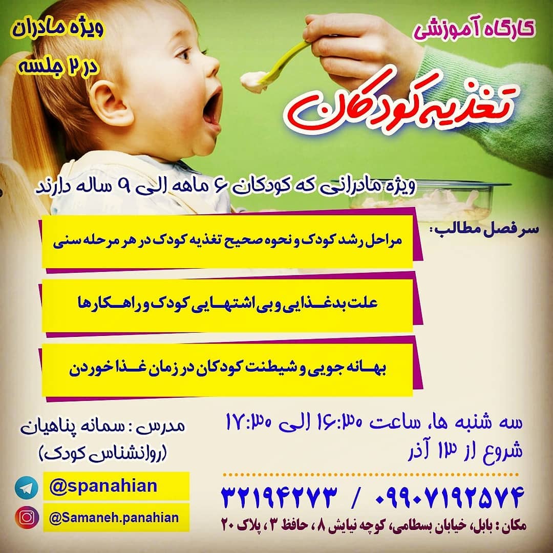 کارگاه آموزشی ۲جلسه ای 🍇 تغذیه کودکان 🍖 سه شنبه ها،ساعت ۱۶:۳۰ الی ۱۷:۳۰ 🍎 شروع از ۱۳ آذر 🍲 ویژه مادرانی که کودکان ۶ ماهه الی ۹ ساله دارند ❇️ بابل، خیابان بسطامی، کوچه نیایش۸، حافظ۳، پلاک ۲۰ ☎️09907192574 32194273 @samaneh.panahian @samaneh.panahian #سمانه_پناهیان #روانشناس_کودک #آموزش #دفتر_مشاوره_تخصصی_روانشناسی_کودک_خانم_پناهیان #کارگاه_مادروکودک_مازندران #مادروکودک #مازندران_بابل