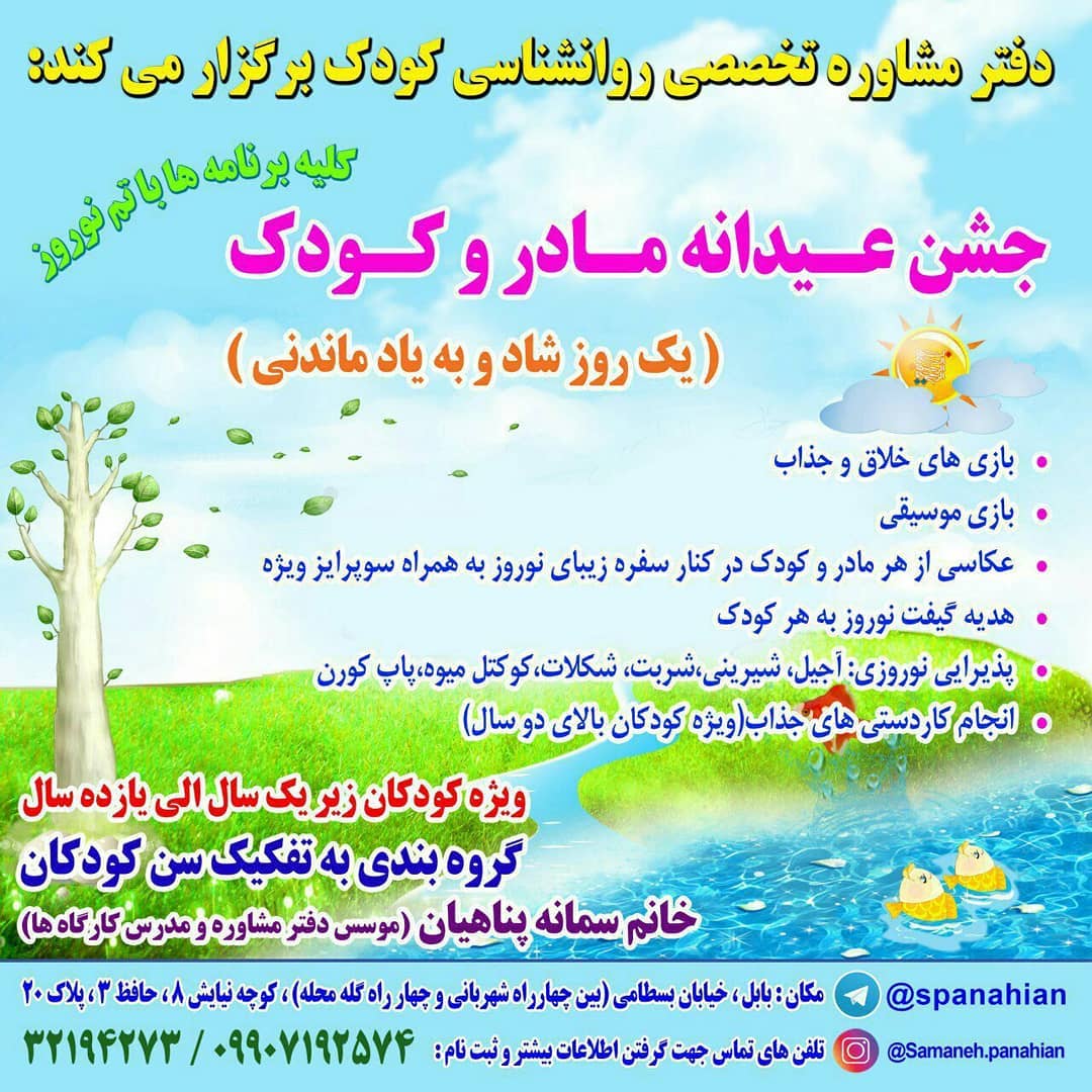 👩👦جشن عیدانه مادر و کودک🤹♀ 🌟ویژه نوروز ❣یک روز شاد وبه یادماندنی ♦️هزینه : ۲۵ هزار تومان ☎️شماره تماس جهت ثبت نام:👇 09907192574 @samaneh.panahian @samaneh.panahian #کارگاه_مادروکودک_مازندران_بابل #عیدانه#سوپرایز#مادروکودک#مازندران#بابل#کودک#جشن#نوروز۹۷#شاد#به_یاد_ماندنی