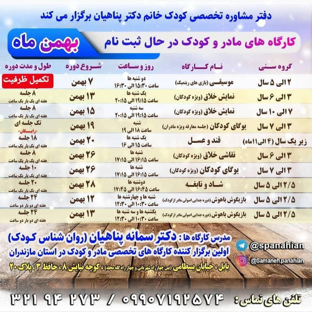 💕 کارگاه های دارای ظرفیت بهمن و اسفندماه👌 ❇ شماره های تماس جهت گرفتن اطلاعات بیشتر و ثبت نام: ☎️09907192574 32194273 @samaneh.panahian #دکتر_سمانه_پناهیان #روانشناس_کودک #اولین_برگزارکننده_کارگاههای_تخصصی_مادروکودک_در_استان_مازندران #دارنده_مجوز_رسمی_از_سازمان_نظام_روانشناسی_و_مشاوره_کشور