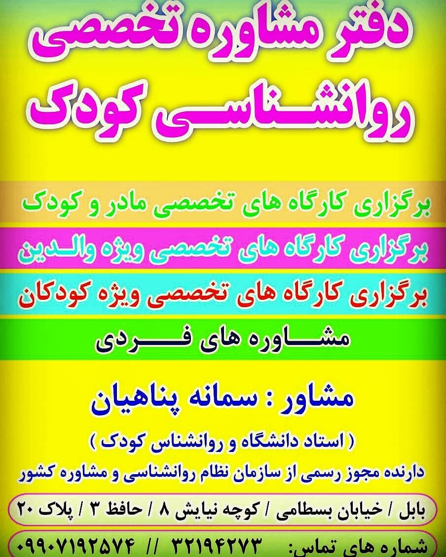 دکتر سمانه پناهیان/ روانشناس کودک و نوجوان اولین برگزار کننده کارگاه های مادر و کودک در استان مازندران آغاز فعالیت از سال 88 مازندران، بابل، کمربندی شرقی، گلستان 15، مجموعه تخصصی روانشناسی کودک و نوجوان