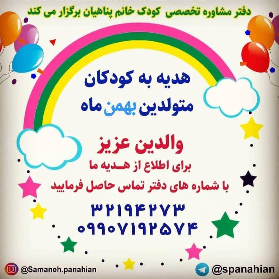 😍💖هدیه تولد به کودکان متولدین بهمن ماه😍💖 برای اطلاع از هدیه، با ما تماس بگیرید😊👇 32194273 09907192574 @samaneh.panahian #دکتر_سمانه_پناهیان #روانشناس_کودک #اولین_برگزارکننده_کارگاههای_تخصصی_مادروکودک_در_استان_مازندران #دارنده_مجوز_رسمی_از_سازمان_نظام_روانشناسی_و_مشاوره_کشور