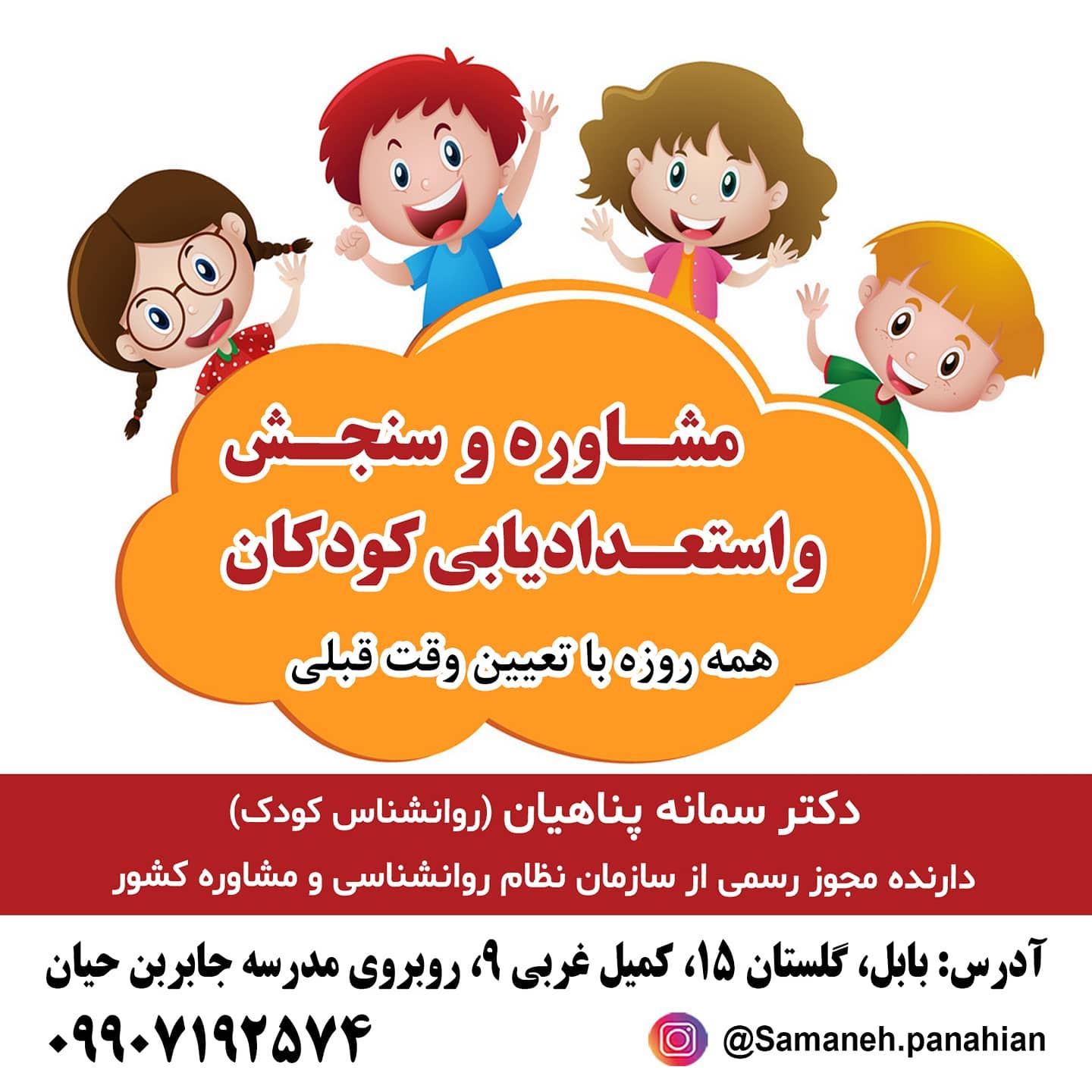 دکتر سمانه پناهیان/ روانشناس کودک و نوجوان اولین برگزار کننده کارگاه های مادر و کودک در استان مازندران آغاز فعالیت از سال 88 مازندران، بابل، کمربندی شرقی، گلستان 15، مجموعه تخصصی روانشناسی کودک و نوجوان