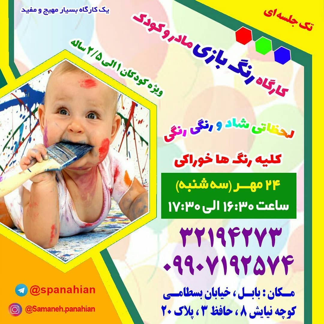 👆یک کارگاه جذاب دیگه رنگ بازی ✨ویژه گروه سنی ۱ الی ۲/۵ سال✨ 💚 کلیه رنگ ها👈 خوراکی 🔷زمان: ۲۴مهر(سه شنبه )، ساعت۱۶:۳۰ الی ۱۷:۳۰ 🔷هزینه: ۲۸ هزارتومان 09907192574 32194273 مازندران،بابل،خ بسطامی، نیایش۸، حافظ۳، پلاک ۲۰ @samaneh.panahian @samaneh.panahian @samaneh.panahian #کارگاهمادروکودک #مازندران_بابل #رنگ_بازی #سمانه_پناهیان#روانشناس_کودک#اولین_برگزارکننده_کارگاه_های_تخصصی_مادروکودک_در_استان_مازندران #مادروکودک#بازی#هیجان#شادی#مازندران#بابل