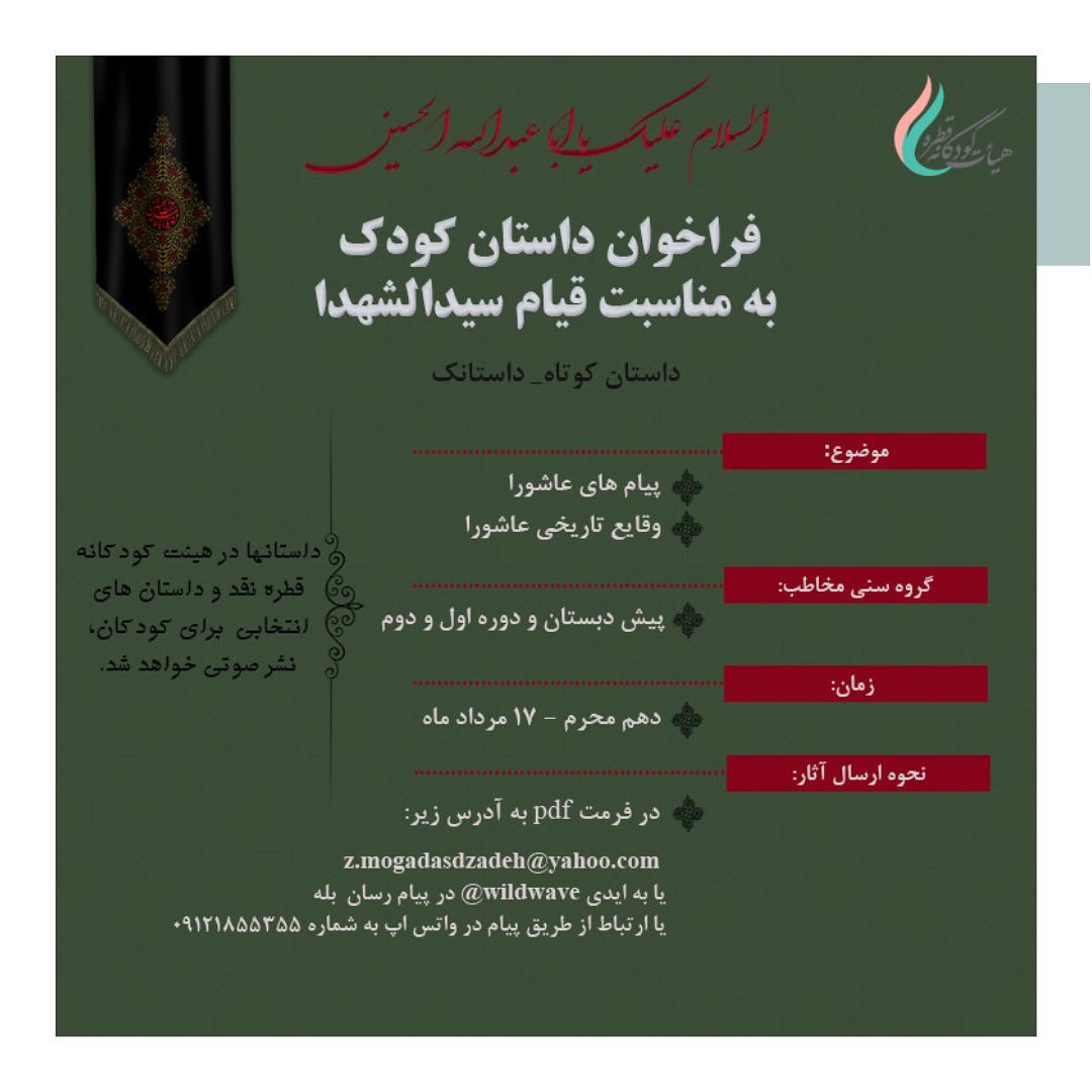 فراخوان داستان کودک به مناسبت قیام سیدالشهدا🌹 🔹داستان کوتاه 🔹داستانک 🌱موضوع: 🔹پیام های عاشورا 🔹وقایع تاریخی عاشورا 🌱گروه سنی مخاطب: پیش دبستان ودوره اول و دوم 🔅 داستانها در هیئت کودکانه قطره نقد خواهد شد و داستان های انتخابی برای کودکان نشر صوتی خواهد شد. 🔅 📆 زمان : دهم محرم _ ۱۷ مرداد ماه ✅داستانها در فرمت pdf به ادرس زیر: z.mogadasdzadeh@yahoo.com یا به ایدی @wildwave در پیام رسان بله 09121855355 ارتباط از طریق پیام در واتس اپ 🔸 شرکت کنندگان در گروه نقد قطره عضو خواهند شد. صفحه اینستاگرام هیئت کودکانه قطره👇 http://instagram.com/ghatre_group صفحه ما در پیامرسان بله و ایتا👇 https://ble.ir/ghatre97 Eitaa.com/ghatre97 صفحه ما در پیامرسان واتس آپ👇 https://chat.whatsapp.com/ KQWKESxC1Do2bldtoCqSSR #فراخوان_داستان #داستان_کوتاه#فراخوان_داستان_کوتاه #فراخوان_داستان_نویسی #داستان_نویسی#داستانک