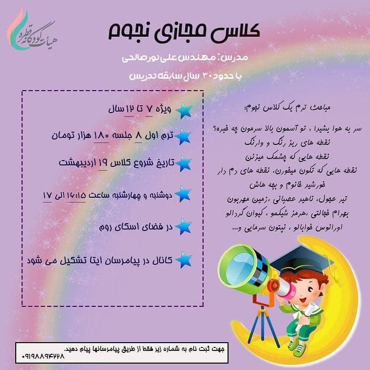 💫 *کلاس مجازی نجوم* 💫 🌝 ترم یک 🌛ویژه ۷ تا ۱۲ سال 🌚۸ جلسه ۱۸۰ هزار تومان 🌖 تاریخ شروع کلاس ۱۹ اردیبهشت 🌎دوشنبه و چهارشنبه ساعت ۱۶:۱۵ الی ۱۷ 🌙در فضای اسکای روم جهت ثبت نام به ایدی زیر مراجعه نمایید 09198894228 @montazereyaar صفحات مجازی هییت کودکانه قطره https://ble.ir/ghatre97 1. https://chat.whatsapp.com/KQWKESxC1Do2bldtoCqSSR 2. https://chat.whatsapp.com/F6Us8zp8l9KBWnwHYFxPki https://eitaa.com/joinchat/533921815C182a58e38d #کلاس_مجازی_نجوم #کلاس_نجوم #کلاس_نجوم_کودک #هیئت_کودکانه_قطره