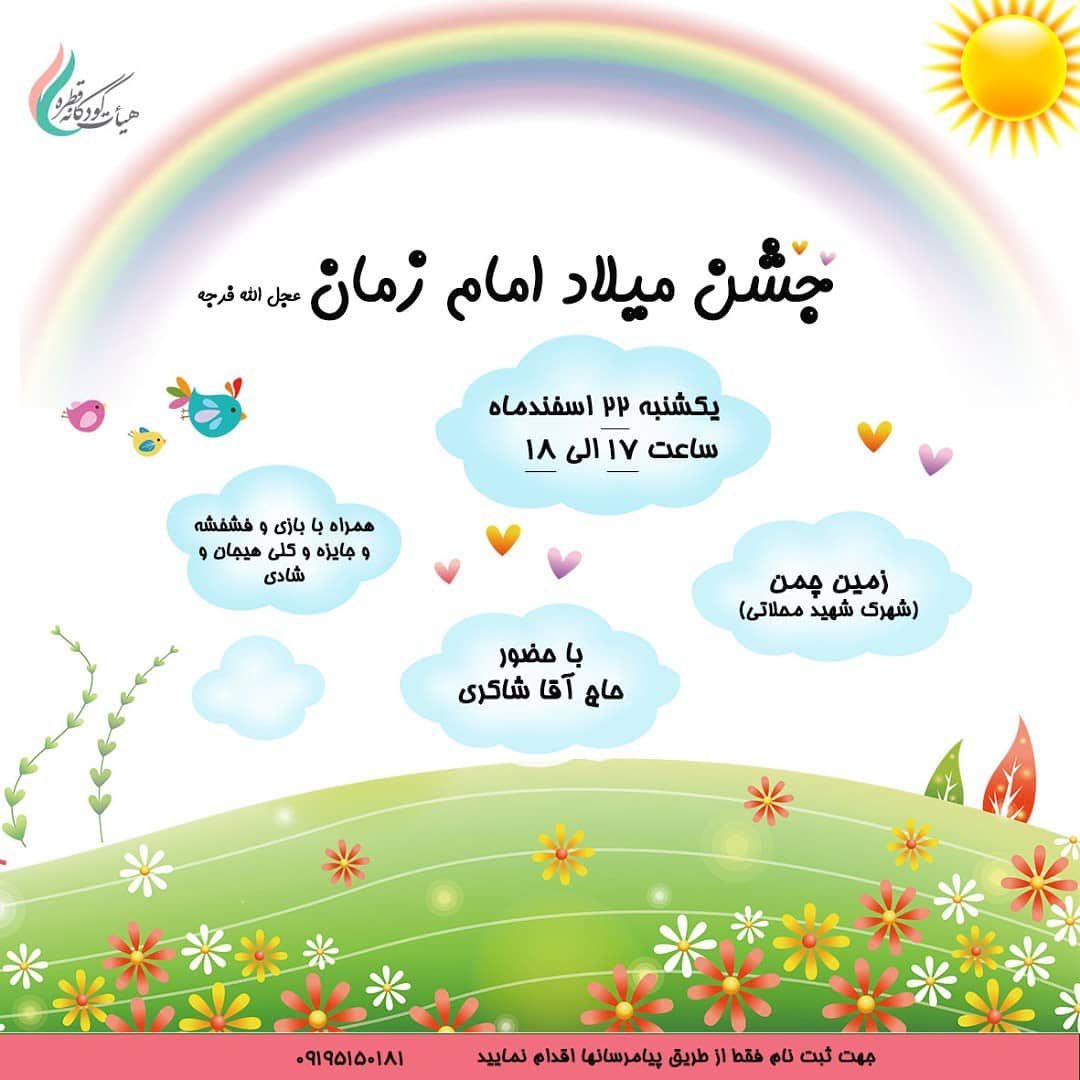 📣🌸📣🌸📣🌸📣🌸📣🌸📣 🎊 *ویژه برنامه جشن ولادت صاحب الزمان عجل الله تعالی فرجه الشریف* 🎊 باحضور *حاج آقا شاکری* (عمو روحانی محبوب بچه ها)🌸 زمان: *یکشنبه ۲۲ اسفندماه* 🌸 *ساعت ۱۷الی ۱۸* 🌸 مکان: *زمین چمن* شهرک شهید محلاتی 🌸 ویژه کودکان ۴ تا ۹ سال🌸 به همراه داشتن *ماسک* و *زیر انداز* برای هر کودک الزامی میباشد.🌸 *برای اجرای بهتر برنامه جشن لطفا راس ساعت حضور بهم رسانید* 🌸 جهت ثبت نام از طریق پیامرسانها اقدام نمایید👇 09195150181 #هیئت_کودکانه_قطره #جشن_مجازی
