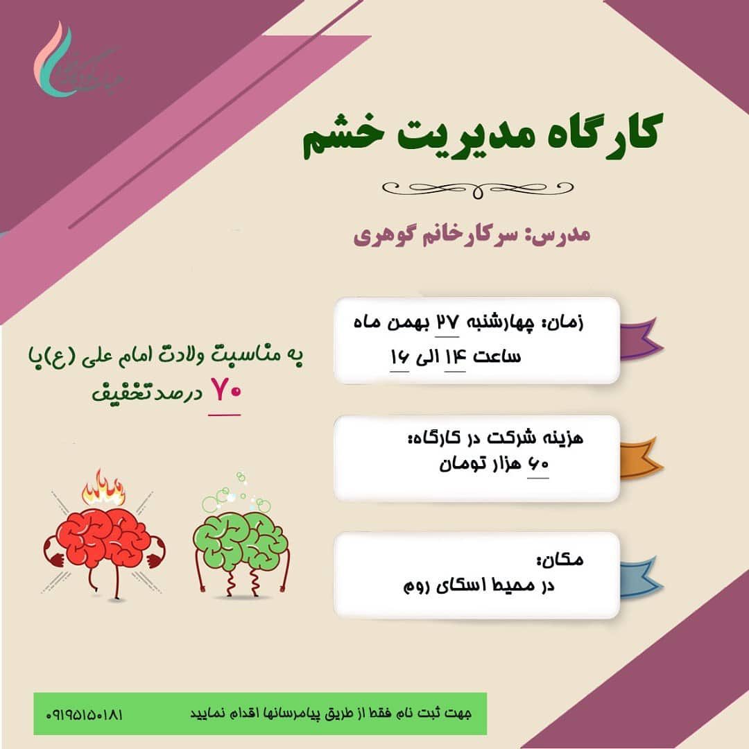 🔥 *کارگاه مدیریت خشم* 🔥 👈 روزا داد میزنم شبا گریه میکنم که چرا داد زدم😤😭 👈فکر کنم بهترین کادو به همسرم شرکت در این کارگاهه🎁😊 ...... *مدرس: سرکار خانم گوهری* 🌸 *زمان: چهارشنبه ۲۷ بهمن ماه ساعت ۱۴ الی ۱۶ مکان: به صورت مجازی در محیط اسکای روم مبلغ ثبت نام: به مناسبت ولادت امیرالمومنین با ۷۰ درصد تخفیف، ۶۰ هزار تومان 😳👌 ثبت نام فقط از طریق پیامرسانها: 09195150181 #کارگاه_مجازی #مدیریت_خشم #هیئت_کودکانه_قطره #ویژه_مادران #روز_پدر