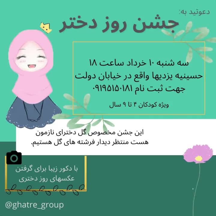 😍🎊😍🎊دخترای گل خبر خبر😍🎊😍🎊 💕 جشن ولادت حضرت معصومه سلام الله علیها و روز دختر💕 باحضور عمو روحانی حاج آقا شاکری🌱 همراه با دکور ویژه عکاسی مخصوص دخترای گلمون ، که با لباسای خوشگل بیان و عکاس ازشون عکس بگیره و فایل عکس تقدیمتون بشه😍📸 روز سه شنبه ۱۰ خرداد ساعت ۱۸ 🕰 مکان: حسینیه یزدی ها واقع در خیابان دولت🎀 ⚠️این برنامه جهت دختران گل ۴ تا ۹ سال میباشد.⚠️ جهت ثبت از طریق پیامرسانها با ما در ارتباط باشید👇 09195150181 @shejazi #جشن_ولادت #جشن_روز_دختر #روز_دختر #جشن
