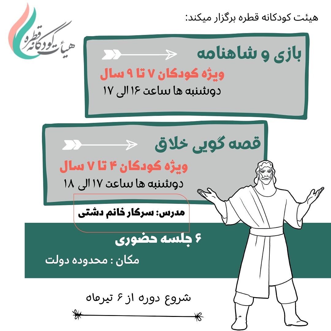 کارگاه بازی و شاهنامه😊 مربی: نسرین دشتی ویژه کودکان ۷ تا ۹ سال 👩🧑 دوشنبه ها ساعت ۱۶ الی ۱۷ ⏰ شروع دوره از ۶ تیرماه 📆 ۶ جلسه حضوری مکان : محدوده دولت شهریه :۲۳۰ هزار تومان 💳 🔹🔸🔹🔸🔹🔸🔹🔸 قصه گوی خلاق نسرین دشتی ویژه کودکان ۴ تا ۷ سال 🧒👦 دوشنبه ها ۱۷ الی ۱۸ ⏰ شروع دوره از ۶ تیرماه 📆 ۶ جلسه حضوری مکان : محدوده دولت شهریه ۲۳۰ هزار تومان 💳 ثبت نام فقط از طریق پیامرسانها: 09190161204 #کلاس_تابستانی #کلاس_قصه_گویی #کلاس_شاهنامه_خوانی #شاهنامه_خوانی #کودک#کودکانه#کودک_نوجوان #قصه_گویی_خلاق