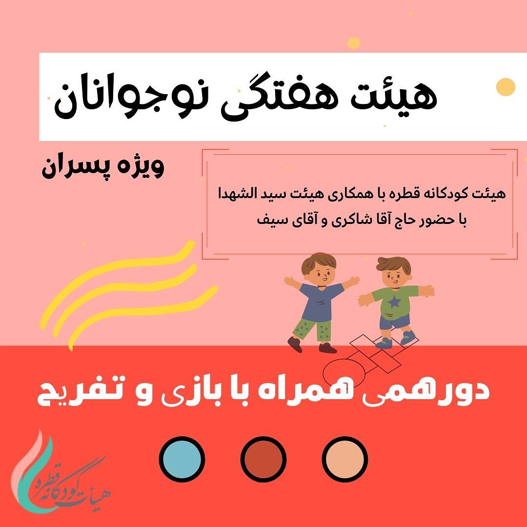 دورهمی همراه با بازی و تفریح ▪️ در دو گروه سنی ۵ تا ۸ سال و ۹ تا ۱۲ سال ▪️ یکشنبه ها ساعت ۱۹:۳۰ تا ۲۰:۳۰ ▪️ محدوده منطقه ۱ ▪️ هر ترم ۴ جلسه ۱۳۰ت ▪️ ظرفیت محدود ▪️ ثبت نام فقط از طریق پیامرسانها ۰۹۳۰۹۵۰۳۱۳۳ #هیئت_هفتگی#عمو_روحانی#دورهمی#پسرانه#بازی#شادی#نوجوان#نوجوانان#کلاس_پسران