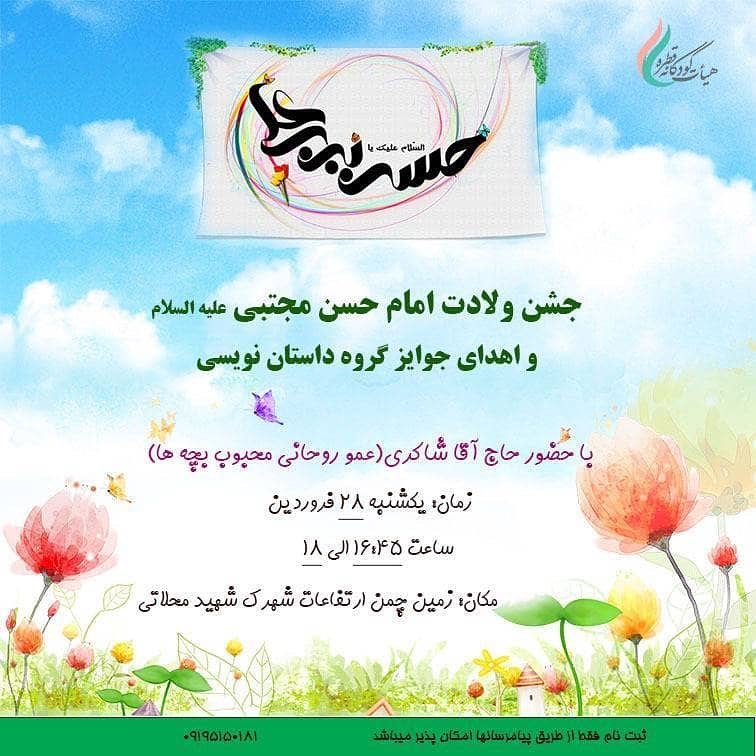 🎊 *جشن ولادت امام حسن مجتبی علیه السلام* 🎊 و 🦋 *اهدای جوایز گروه داستان نویسی* 🦋 با حضور حاج آقا شاکری عمو روحانی محبوب بچه ها زمان: یکشنبه ۲۸ فروردین ساعت: ۱۶:۴۵ الی ۱۸ 🌸 ثبت نام جهت حضور در جشن الزامی باشد. 🌸برنامه رایگان می باشد. 🌸زیر انداز و وسایل شخصی اب و خوراکی به همراه داشته باشید. به دلیل ماه مبارک خوراکی در جشن توزیع نمیگردد. 🌸 به علت عدم پیش بینی تعداد شرکت کنندگان امکان تنوع هدایا وجود دارد. برای ثبت نام لطفا فقط با شماره ۰۹۱۹۵۱۵۰۱۸۱ از طریق پیام رسانها اقدام بفرمایید. #جشن_ولادت_امام_حسن #هیئت_کودکانه_قطره