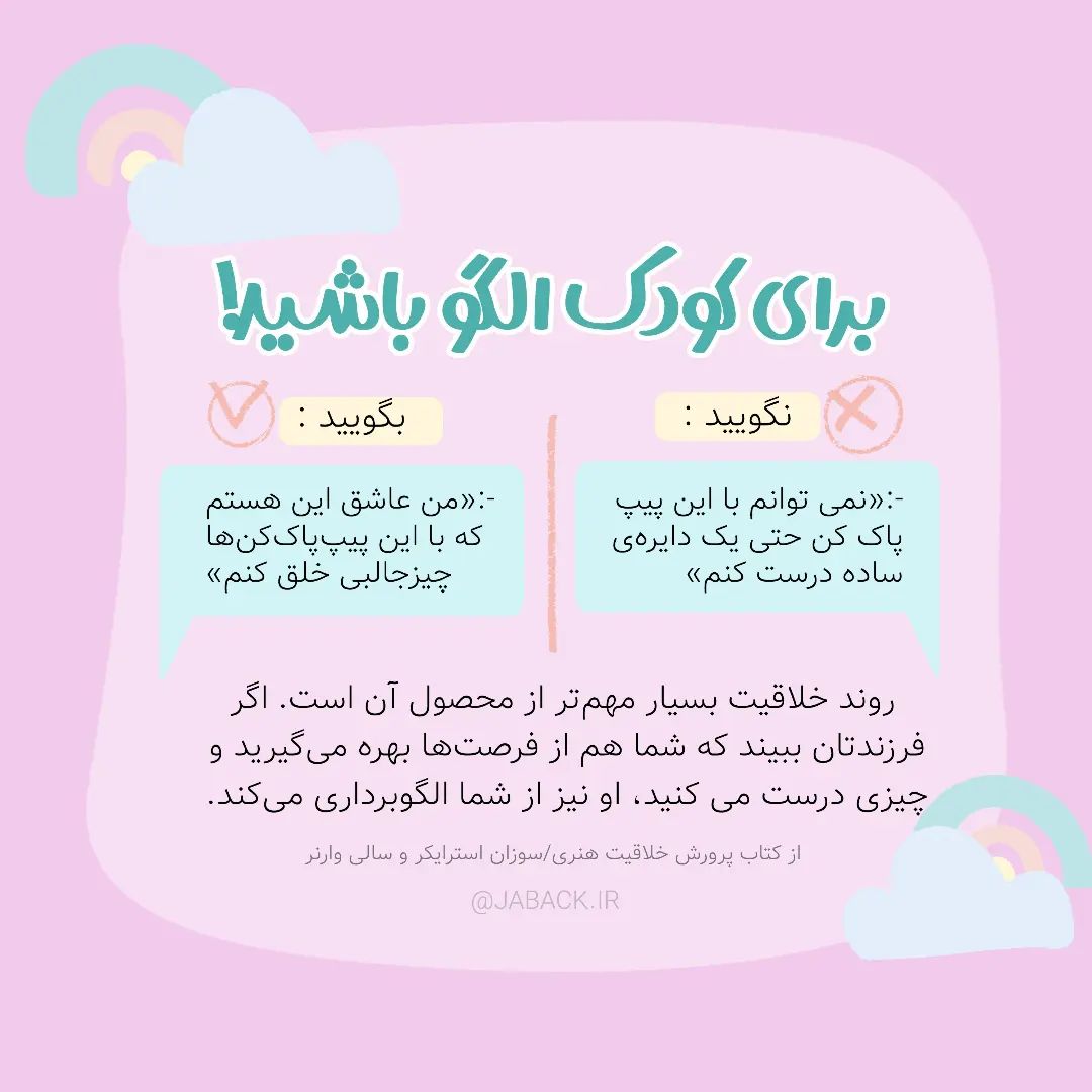 💬 این جمله که میگه :" بچه ها اونی که ما میخوایم نمیشن، بلکه اون چیزی میشن که خودمون هستیم." یه مثال عینیش موقع کاردستی درست کردن یا بازی کردن همینی هست که تو این پست گفتیم. ما میتونیم به بچه ها یاد بدیم اسراف نکنن، از هر وسیله ای یه استفاده ای کنن حتی اگر خرابه، اهل تقلب نباشن یا اینکه زود ناامید نشن و دست از تلاش برندارن اگر خودمون تو زندگی اینها رو رعایت کنیم. شما سعی میکنید موقع بازیکردن یا کاردستی درست کردن تو چه زمینه ای الگوی بچه ها باشین ؟ . #روانشناسی_کودک #روانشناسی_رشد #جعبک #جعبک_ابزار #جعبک_کاردستی #پیپ_پاک_کن #فرزندپروری #فرزند_خلاق #اعتماد_به_نفس_کودک #کودک #کودک_شاد #والدگری #کاردستی_وسایل_بازیافتی #کاردستی_کودک