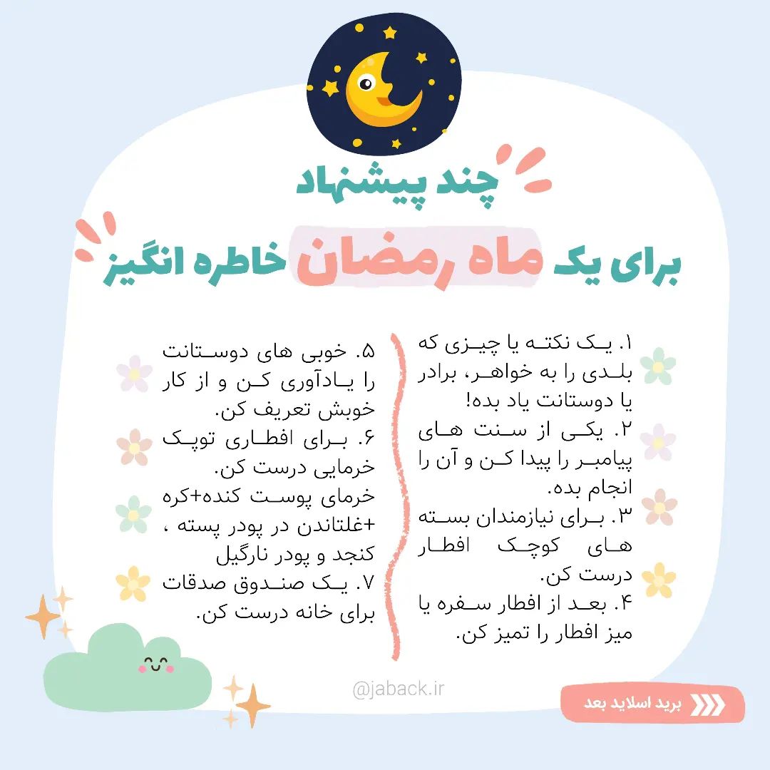 وقتی میگن ماه رمضون یاد چی میفتین ؟ حس الانمون نسبت به خیلی از مناسبت ها و ایام ویژه توی سال ارتباط مستقیمی داره با خاطره هایی که توی سنین پایین پدر و مادرهامون برامون ساختن.... با چندتا راهکار ساده میتونیم کاری کنیم بچه ها تا سال های سال حس و حال متفاوتی نسبت به ماه رمضون داشته باشن... شما کدوم یکی از پیشنهادهایی که دادیم رو انجام میدین ؟ . . #ماه_رمضان #روزه_کله_گنجشکی #سرگرمی_کودک #بازی_با_کوک #فرزندپروری #والدگری #والدین_نمونه #والدین_بخوانند #والدین_آگاه #کودک_شاد #کودک_سالم #تربیت_فرزند #تربیت_کودک #تربیت_دینی #تربیت_دینی_فرزند